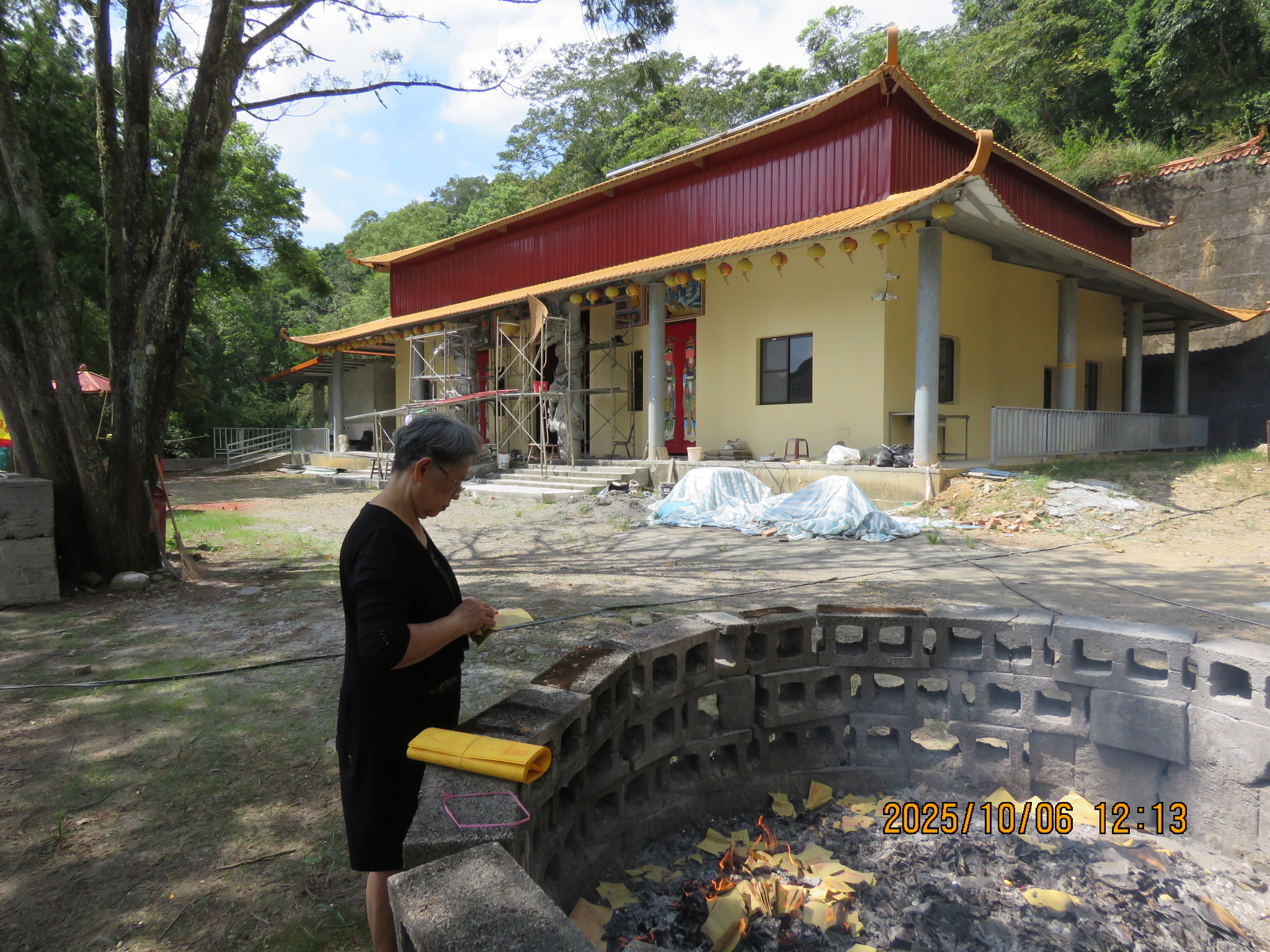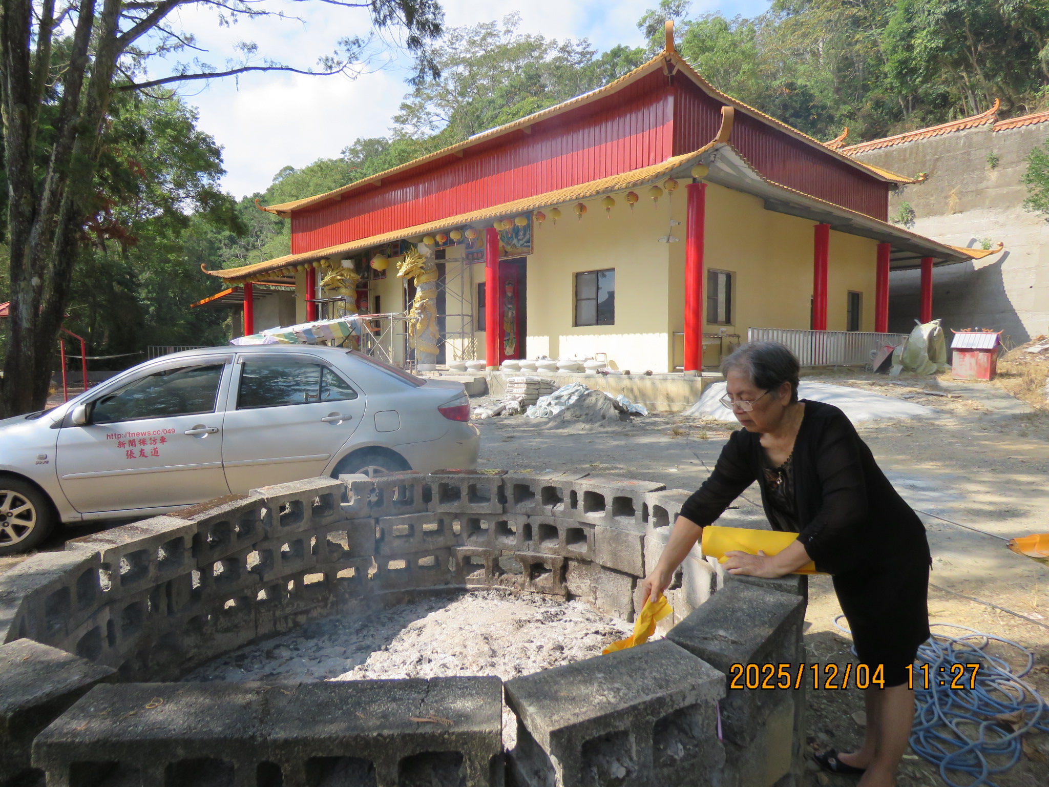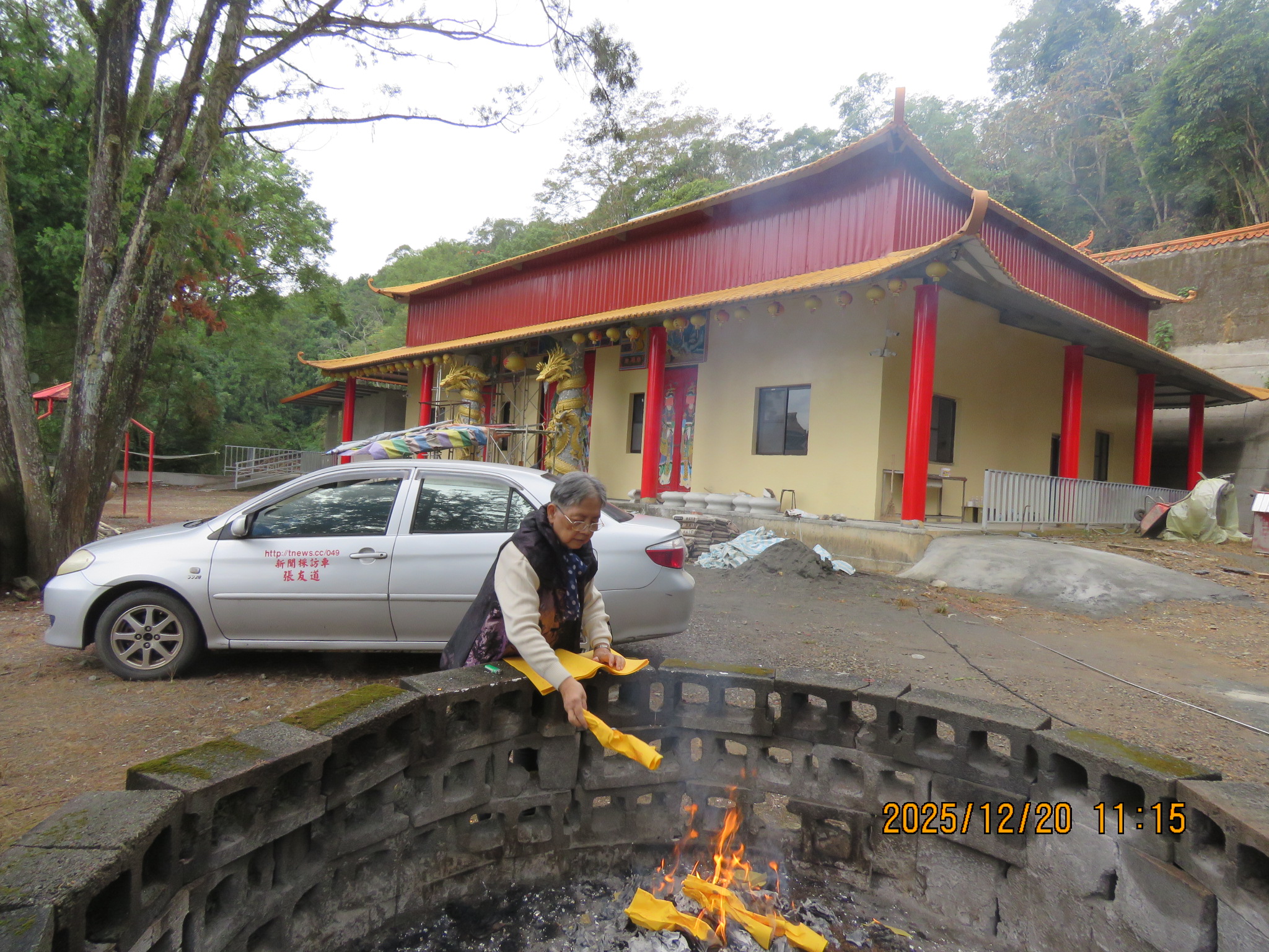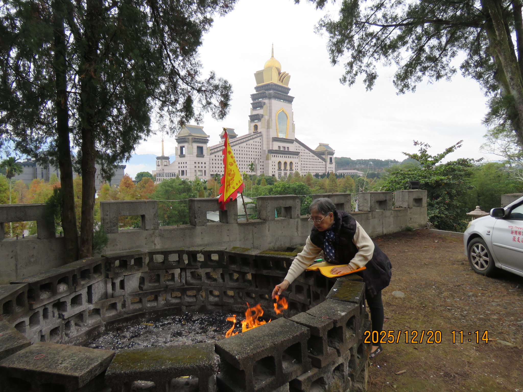 2025(114).12.20.(乙巳.11.01.) 星期六( 第7次照片,第697天),張友道、王金珠抵達埔里金華殿,焚化共15日(乙巳.10.16.~乙巳.11.01.)、45張(3張X15)的『無形文』功課、作業,交給 瑤池金母娘娘主席,恭請 鑑核!(第47次呈繳無形疏文)
