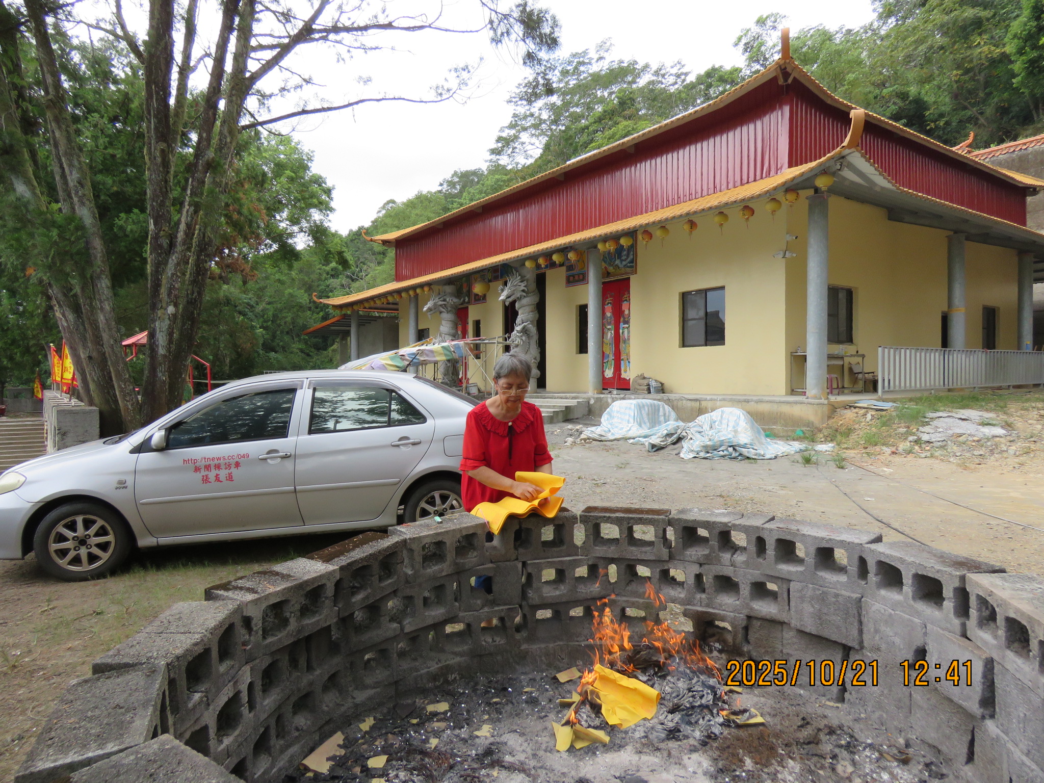 2025(114).10.21.(乙巳.09.01.) 星期二( 第7次照片,第637天),張友道、王金珠抵達埔里金華殿,焚化共15日(乙巳.08.16.~乙巳.09.01.)、45張(3張X15)的『無形文』功課、作業,交給 瑤池金母娘娘主席,恭請 鑑核!(第43次呈繳無形疏文)