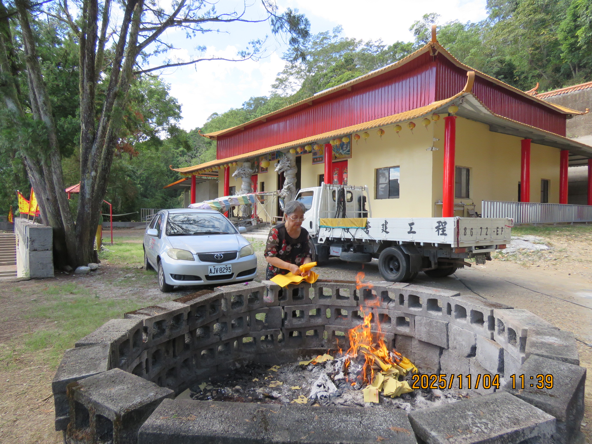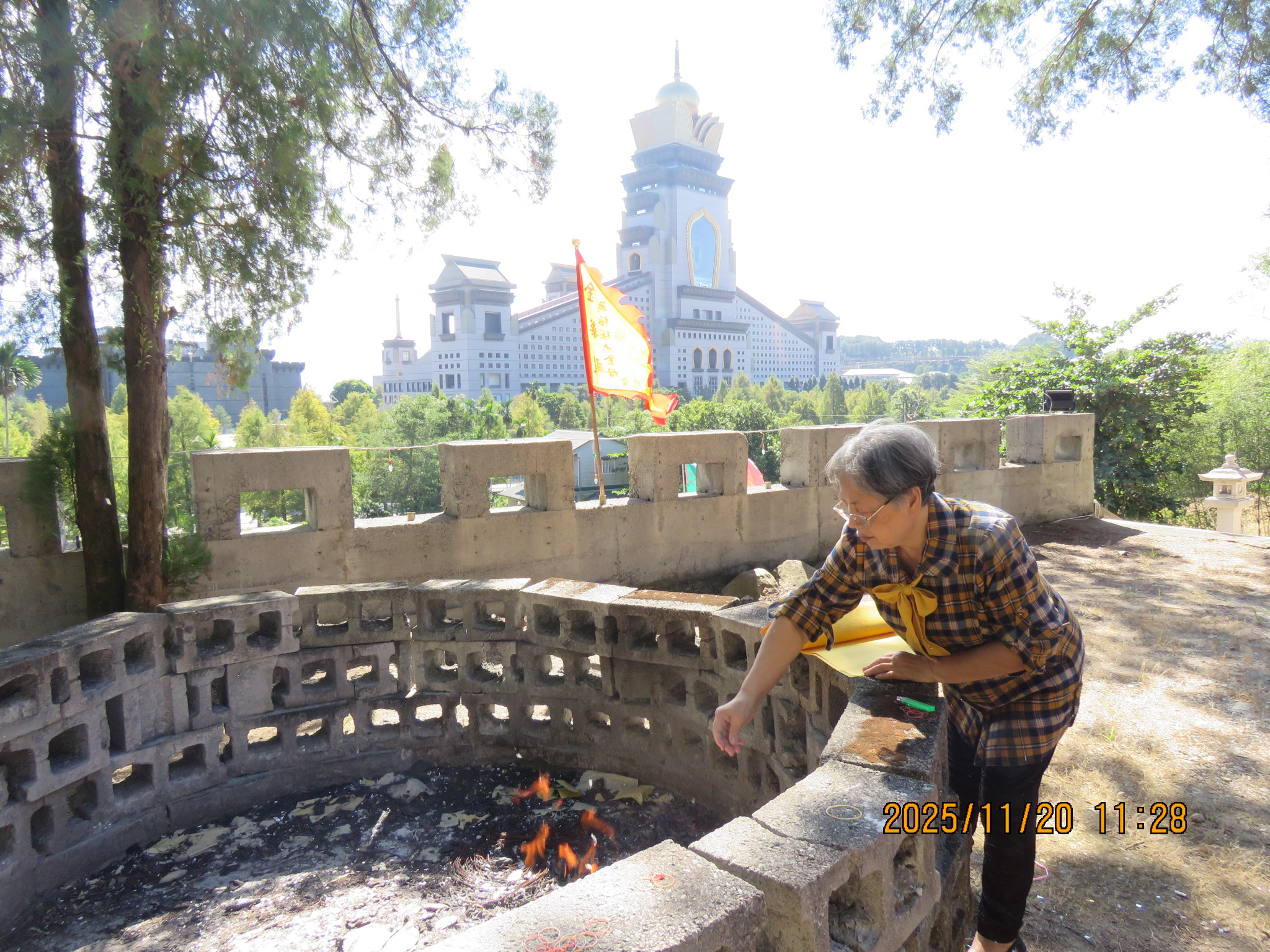 2025(114).11.04.(乙巳.09.15.) 星期二( 第7次照片,第651天),張友道、王金珠抵達埔里金華殿,焚化共15日(乙巳.09.02.~乙巳.09.15.)、45張(3張X15)的『無形文』功課、作業,交給 瑤池金母娘娘主席,恭請 鑑核!(第44次呈繳無形疏文)