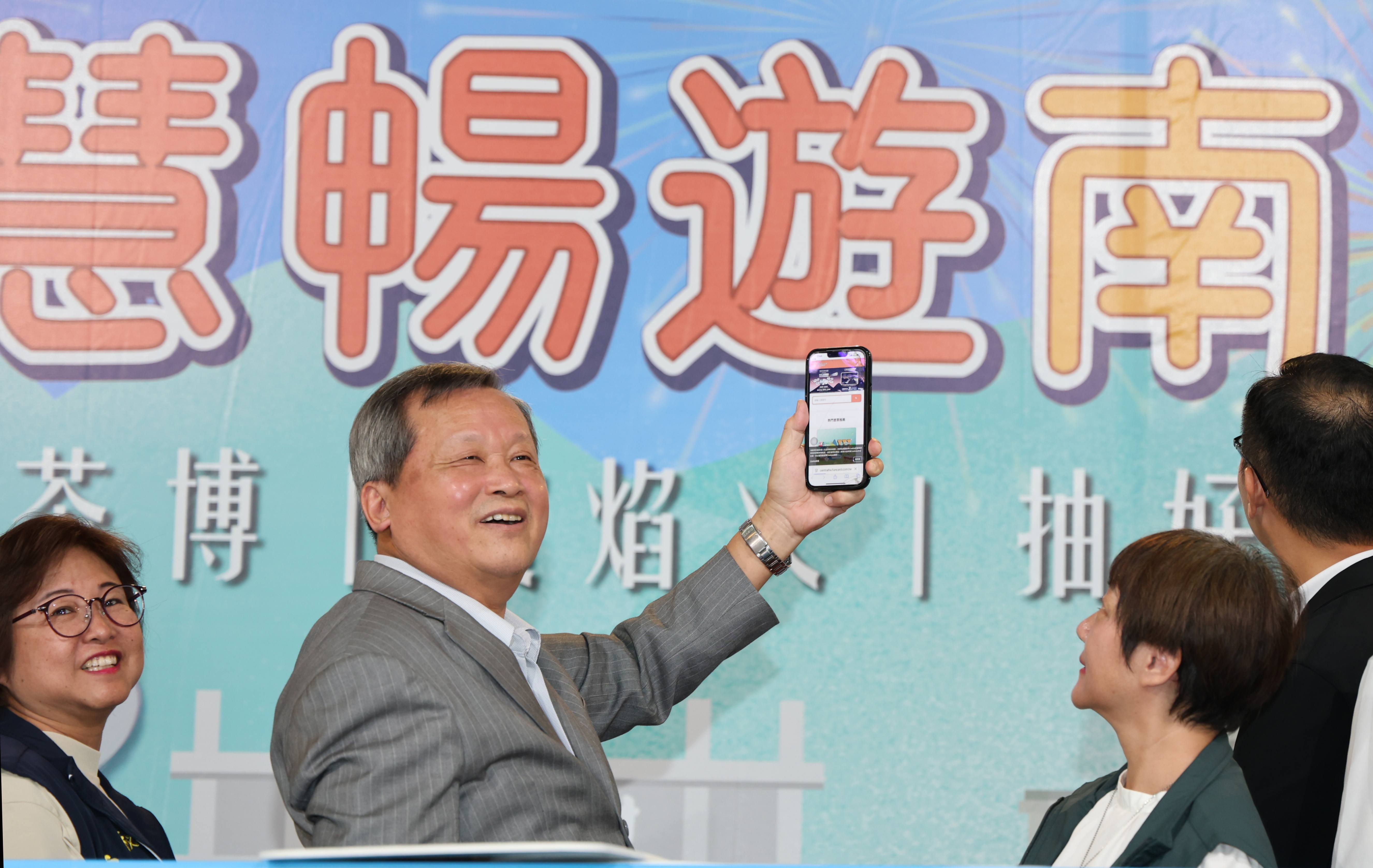 為促進中台灣觀光串聯效益,南投縣政府攜手苗栗縣政府、嘉義縣政府,在交通部觀光署大力支持下,共同推出「114年中台灣好玩卡」,19日在縣府一樓大廳舉辦啟動記者會,副縣長王瑞德代表許淑華縣長主持,並當場以手機掃描QRcode進入購卡程序;