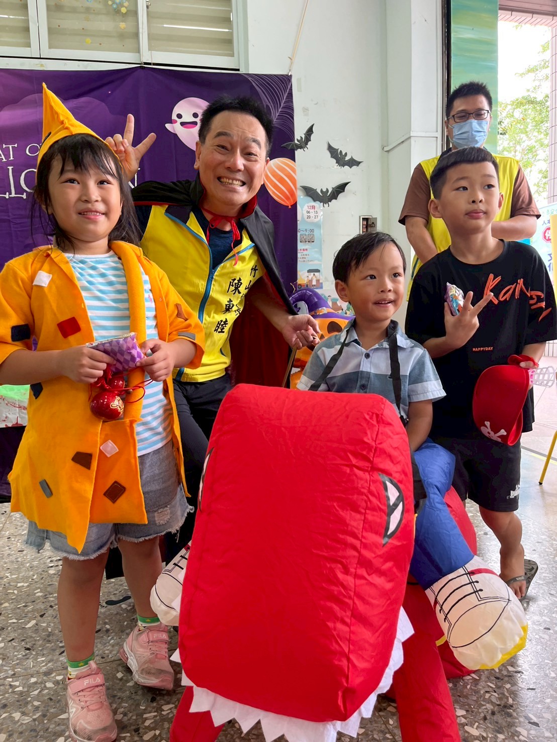 圖二竹山鎮親子館萬聖節「小小萌鬼大集合」親子闖關活動,陳東睦鎮長也裝扮與小朋友和家長玩在一起現場洋溢著節慶氣氛。(竹山鎮公所提供)