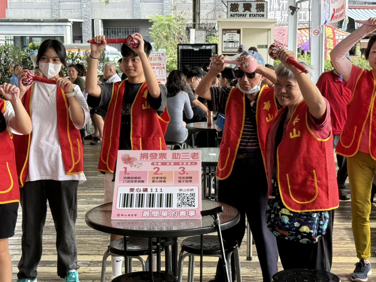 每張發票,都是守護長輩的力量。華山基金會電子發票捐贈碼「111」,以「愛老人1+1再+1」為號召,呼籲大眾將小小發票化做關懷行動,成為支持孤老的後盾。11月1日上午10點30分,華山基金會南投場「111舞動拐杖節」快閃埔里18度C巧克力工房,由在地暨大附中同學,與華山南投區老、中、青義工團體,以行動呼喊「愛老人,你+1、我+1、再+1!」。「111舞動拐杖節」快閃後,同學們一起出發掃街募發票,對著愛心捐贈的人,頻頻說謝謝。