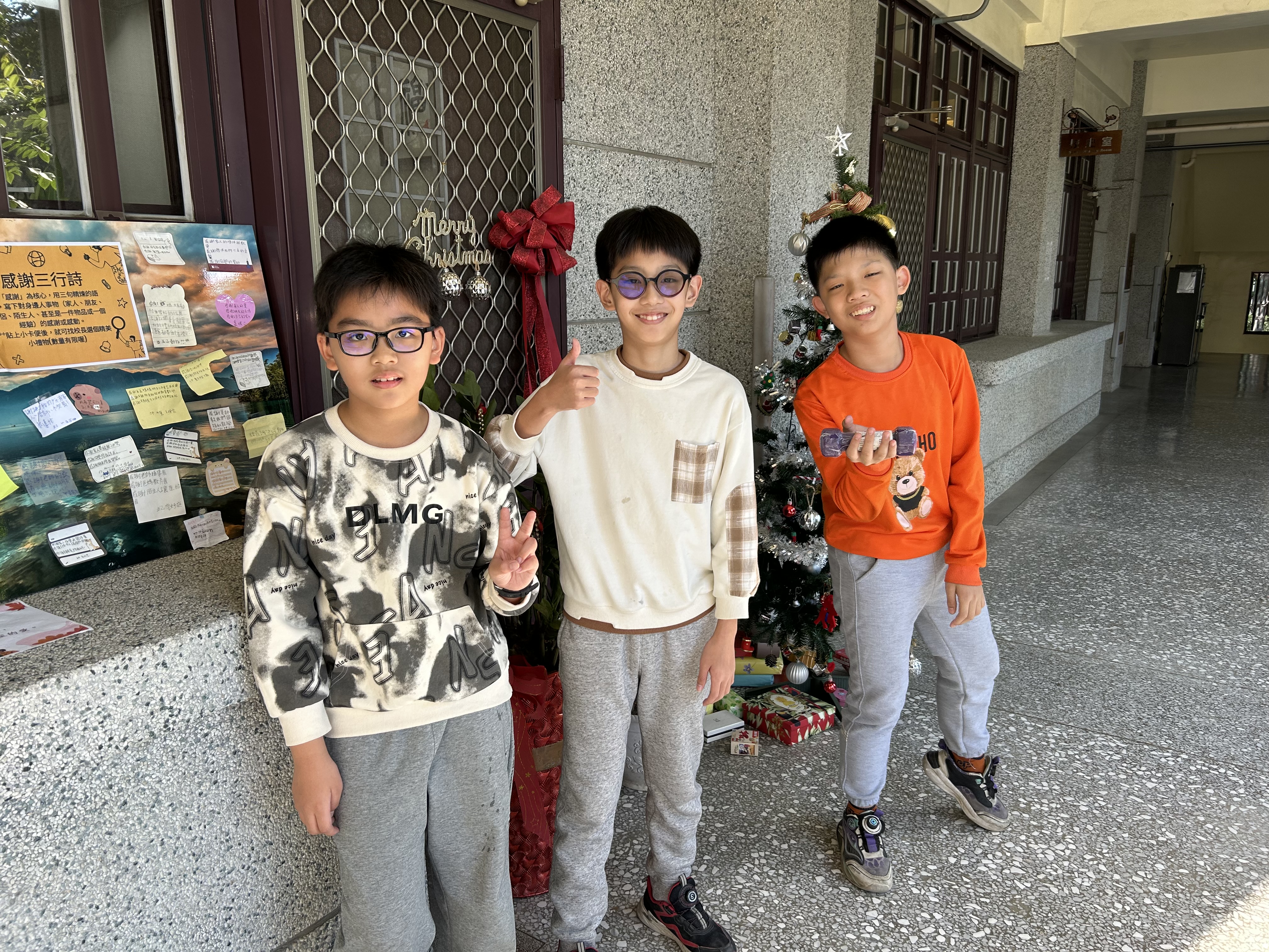 活動以「耶誕樹」為學習主軸,各年級學生輪流至校長室外學習角參與體驗。孩子親手寫下「感恩三句話」,向父母、師長、同學或自己表達感謝與祝福,再將感恩卡片貼在旁邊的留言板。一句句真摯溫暖的話語,讓校園充滿愛與感謝,也讓學童學習「說感謝、懂珍惜」。