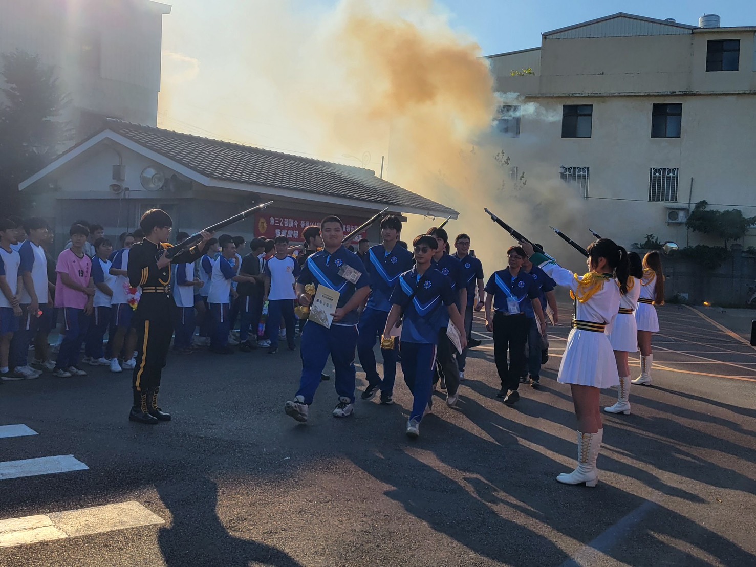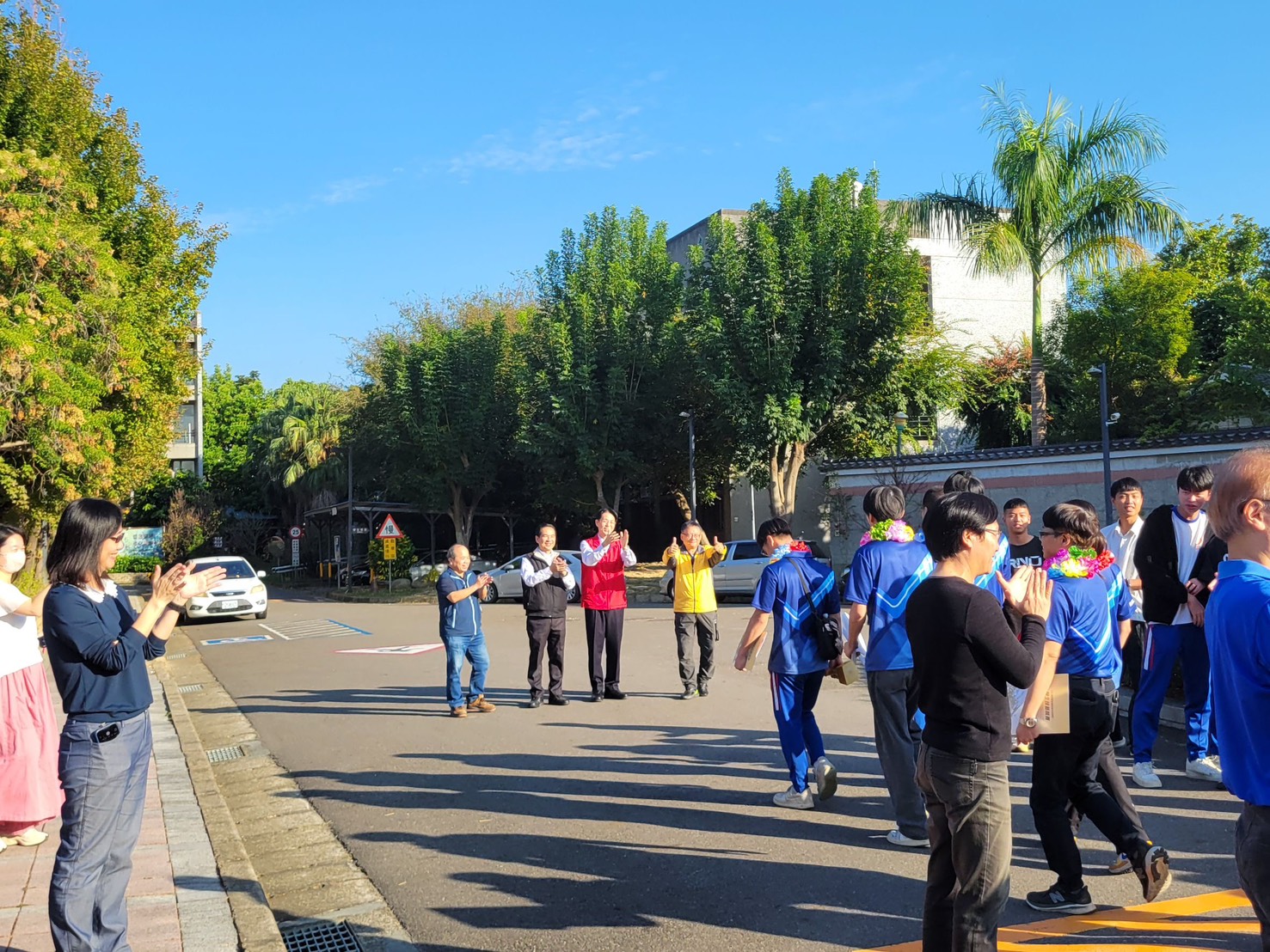 圖二感謝家長會黃憲仁會長、校友會張金來理事長、日新國中蕭進賢校長,與在校師生一同到場祝賀(草屯商工提供)