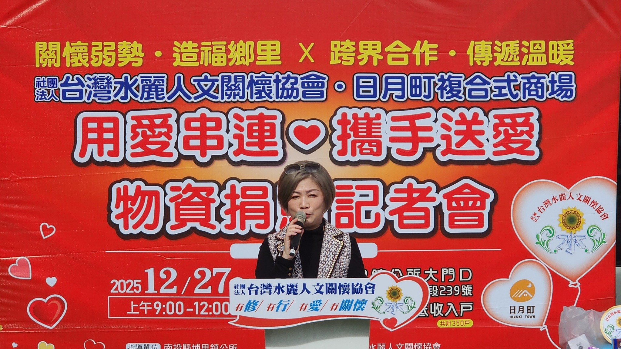 以關懷弱勢、倡導人文精神為宗旨的社團法人水麗人文關懷協會,2016年於臺南市成立,由知名資深藝人方駿擔任創會理事長,從都市走入偏鄉,10年來已舉辦多場慈善物資捐贈、關懷活動及大型公益餐會,愛心足跡包括臺南、高雄、苗栗等縣市,本次由埔里在地業者日月町複合式商場協辦,首度將愛心資源帶進山城埔里,關懷弱勢民眾。結合財團法人慶福社會福利慈善事業基金會、社團法人高雄市八方義行團關懷協會及水誠國際股份有限公司,募集的愛心物資包括白米、醬油、罐頭、保久乳、關廟麵、哈密瓜多多酥、沖泡麥片、衛生紙及家庭清潔劑等豐富的民生用品。