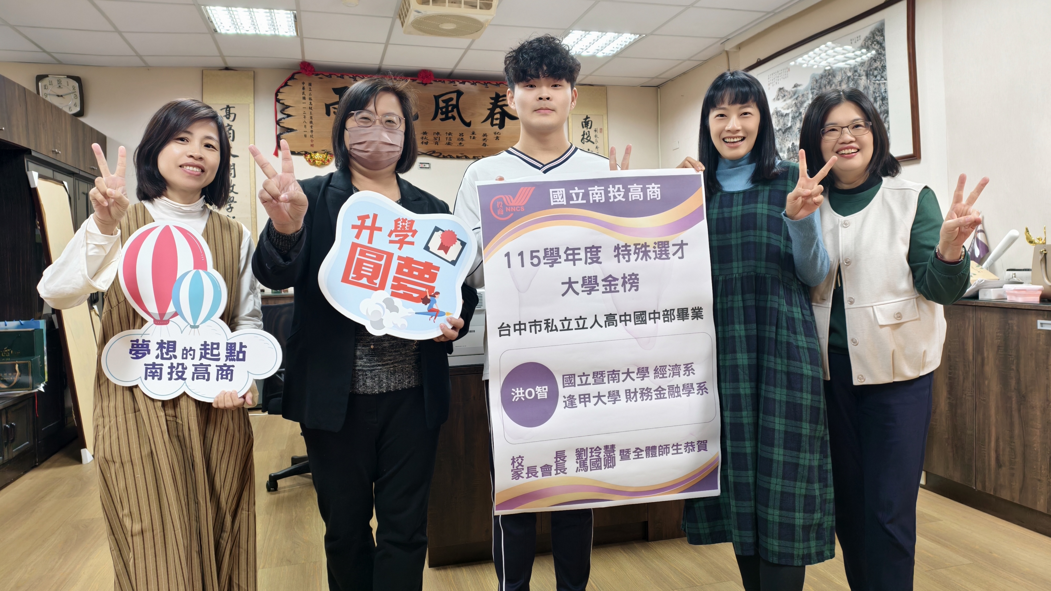 圖一南投高商洪詠智同學(中)在大學特殊選材錄取暨南國際大學經濟系及逢甲大學財經系,與校長劉玲慧(左二)、導師劉致穎(右二)、教務主任(右一)及國貿科主任(左一)合影。(南投高商提供)