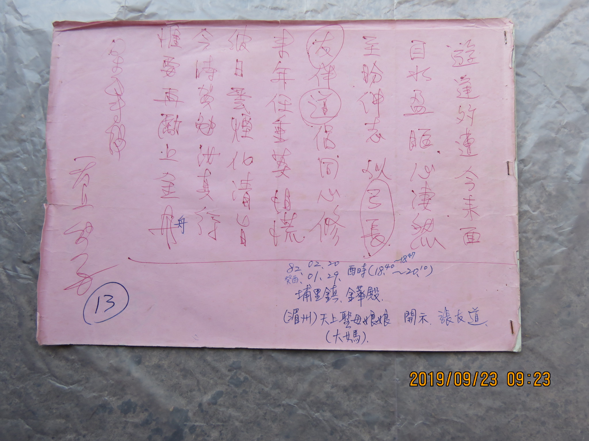 1993﹙82﹚.02.20.(癸酉.01.29.)18:40~18:47,埔里金華殿 天上聖母娘娘(湄州大媽)降示張生友道如下詩句: