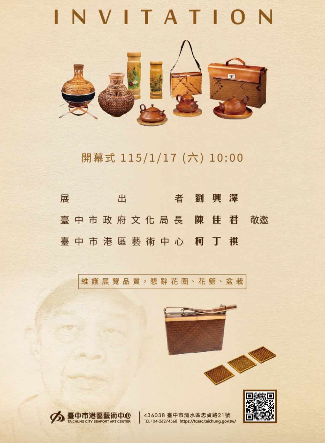 南投竹藝家劉興澤受台中市文化局邀請,於2026-01-17 ~ 2026-02-08在臺中市港區藝術中心展覽室C隆重展出數十件創作。每件作品不僅呈現竹材的柔韌與線條之美,更折射出他對文化傳統的深刻思考。並訂於115年1月17日(六) 10:00舉行開幕式,歡迎欣賞走一回。
