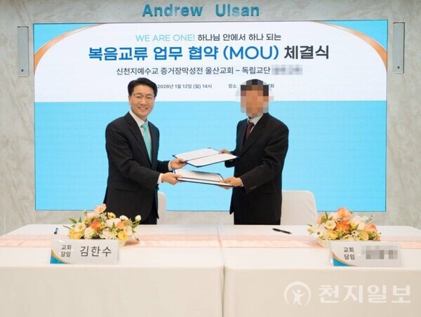 新天地蔚山教會於今年(2026)1 月 12 日,在新天地蔚山教會 3 樓與該獨立教派教會舉行新年首場福音交流 MOU 簽署儀式。雙方在儀式中承諾,未來將以聖經為共同基礎,推動話語交流與相互合作。