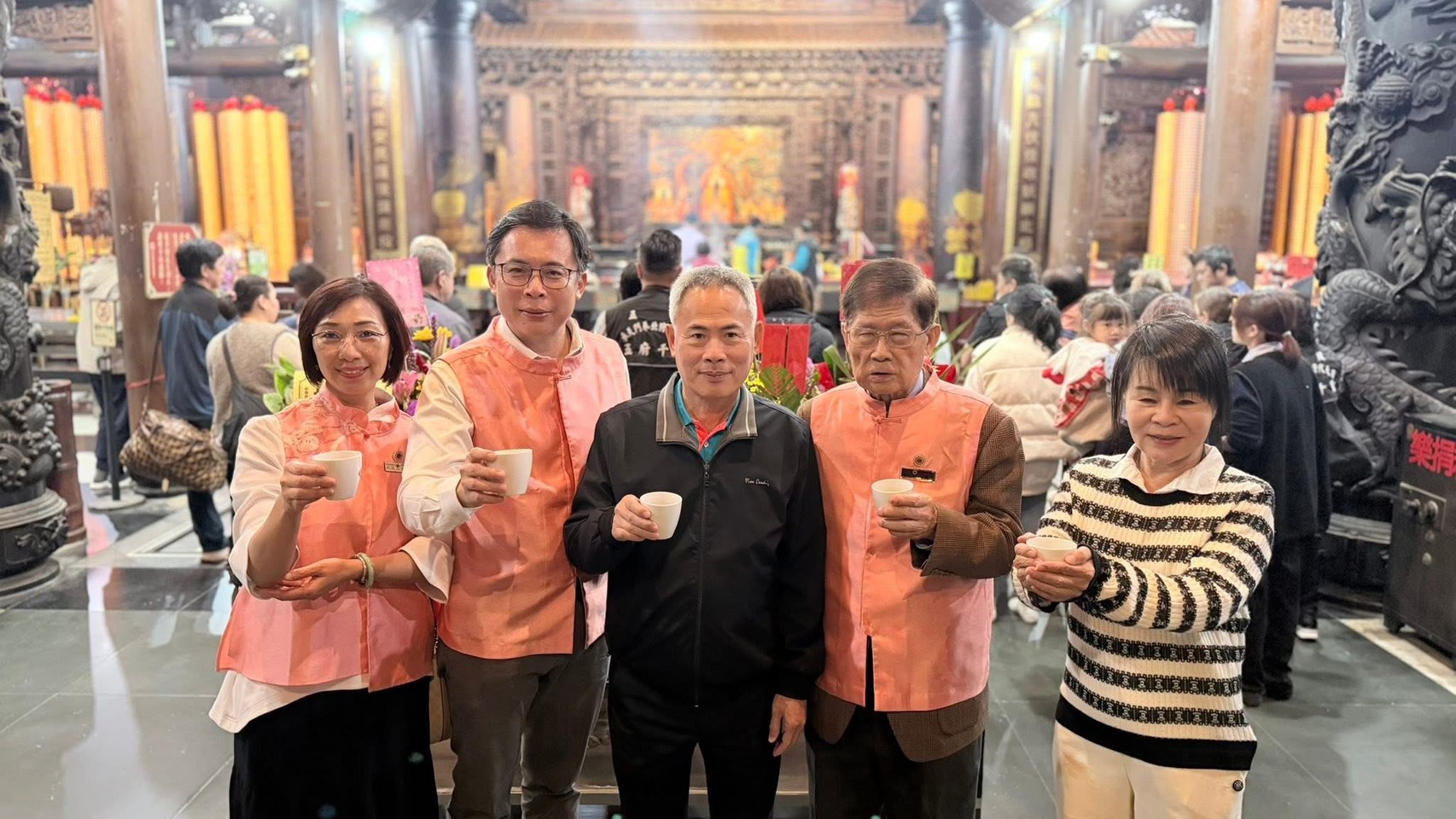 圖二列席來賓右起:陳秀村長、天福集團副總栽李勝治、受天宮主委陳登岳、名間鄉長陳翰立。無我茶會理事長李桂香。(中華松嶺無我茶會提供)