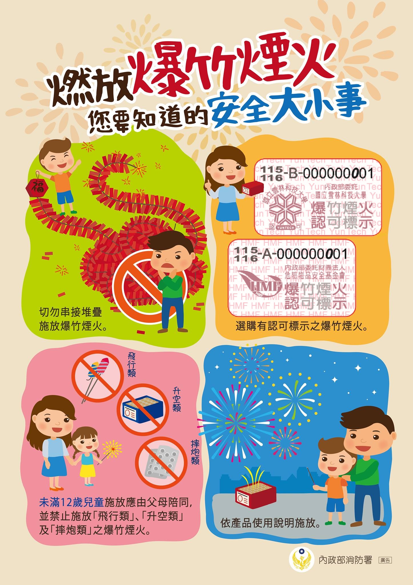 未滿12歲兒童施放時,須由成人陪同,並禁止施放飛行類、升空類及摔炮類爆竹煙火。