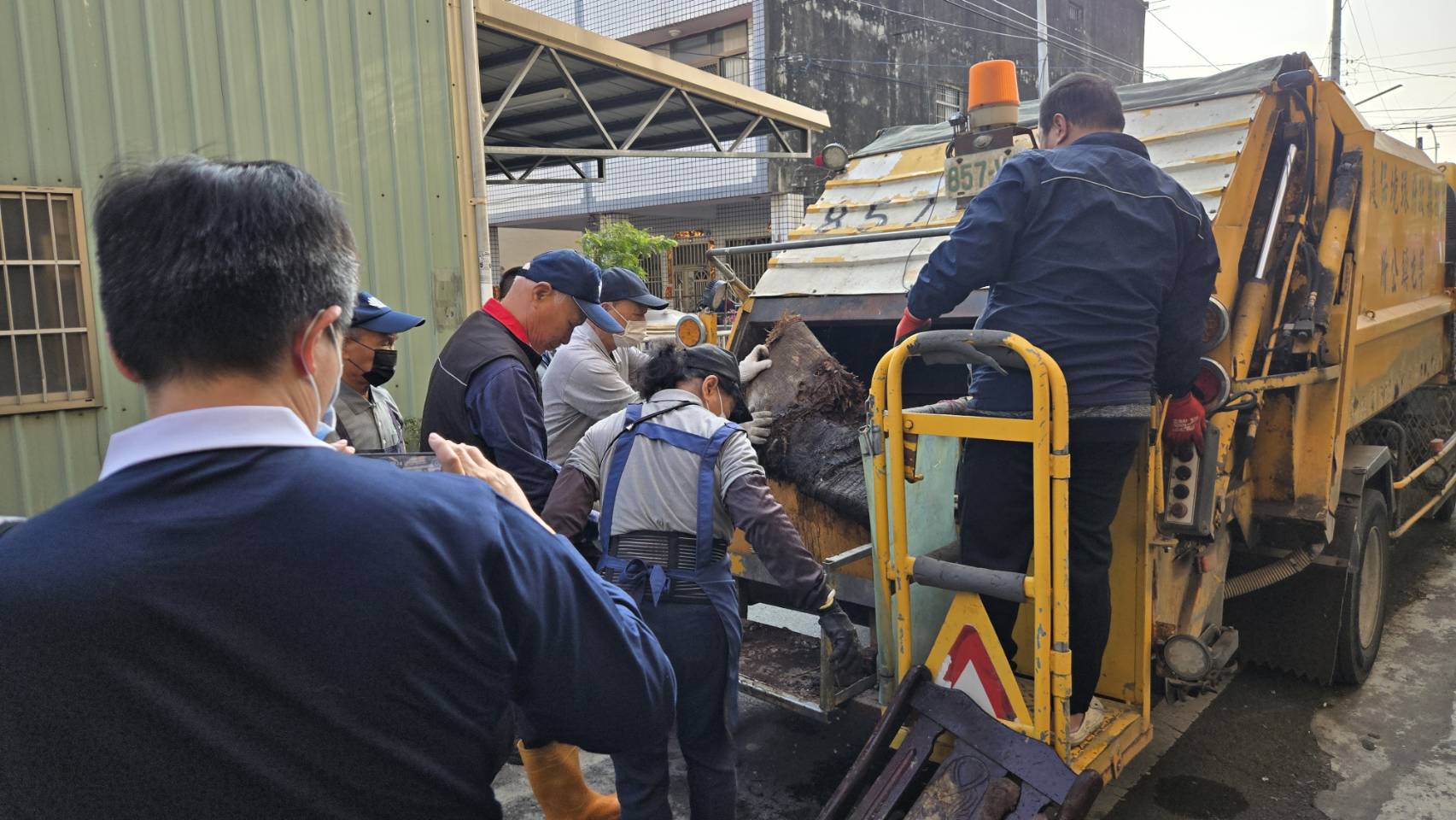 圖二草屯鎮簡賜勝鎮長也前往現場關懷與致意,並派草屯公所清絜隊垃圾車支援搬運廢棄物 。(草屯慈濟提供)