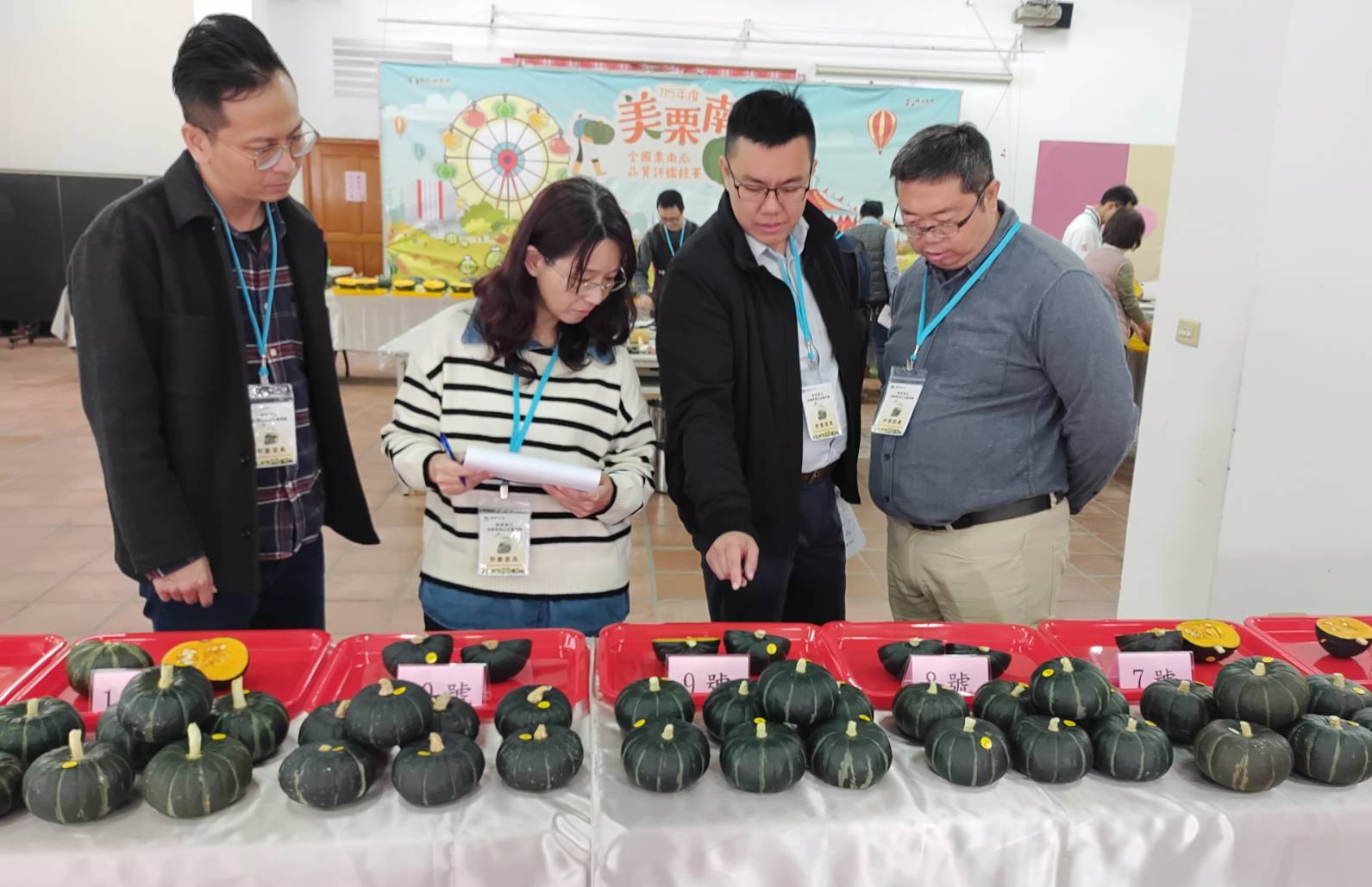 本次栗南瓜品質評鑑活動廣邀全國栗南瓜農友參與,依重量分為大果組及小果組進行評比,經初級評選後,共有大果組42組、小果組18組進入複賽決選。所有參賽樣品皆須通過農藥殘留檢測,確保產品安全無虞,並依外觀、熟度、甜度、口感及整體品質進行專業評選,展現各產區農友在栽培管理上的用心與實力。