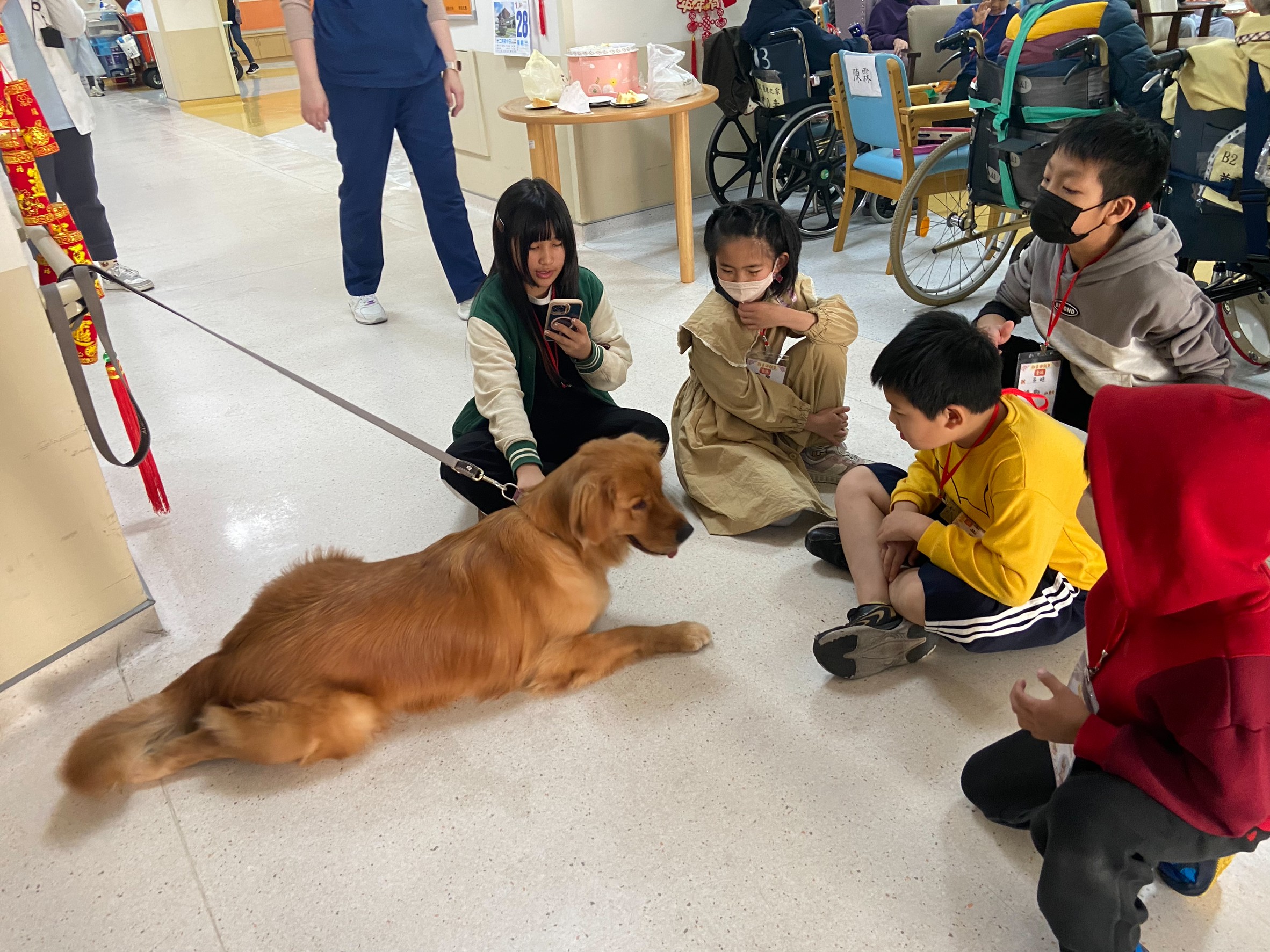 緊接著在護理部主任的貼心安排下贈送小朋友點心,小朋友好奇探索爸爸媽媽的工作環境。孩子們分享與父母在家中相處的情形,一句句童言童語,讓員工們心中充滿成就與感動。下午時光則由養樂居的明星——陪伴犬「養樂多」接力登場。這隻金毛帥氣又溫柔的陪伴犬成為孩子們的焦點,陪著大家度過最療癒的親子時光。孩子們摸著牠、餵牠零食、跟牠合照,笑聲在長照大樓迴盪不止。