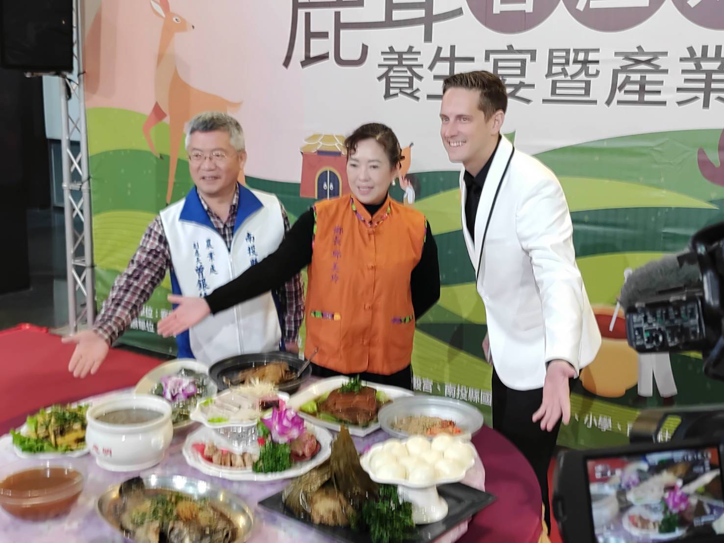 圖三縣府農業處副處長曾銀位(左起)、國姓鄉長邱美玲、及會說中文的老外解說豐沛的客國姓客庄鹿茸養生宴美食。(記者林凌霄攝)