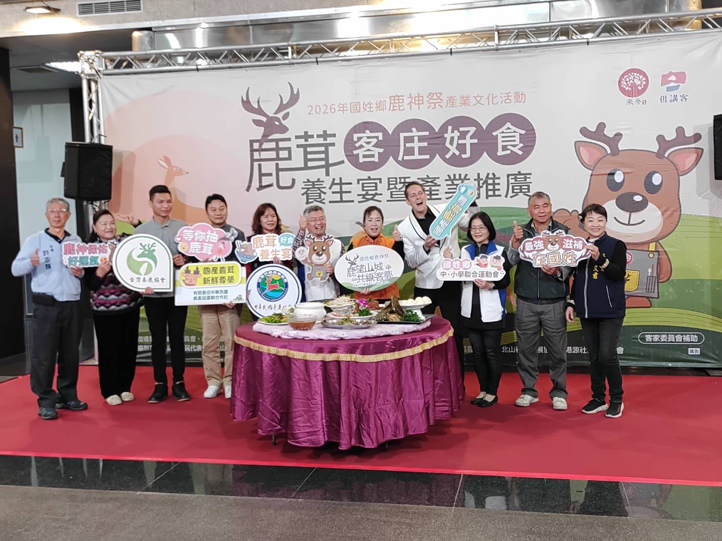 圖一國姓鄉公所今日在縣府一樓大廳舉辦「2026國姓鹿神祭產業文化活動」系列的首場活動—「客庄好食.鹿茸養生宴暨產業推廣展示會」,為年度盛會揭開序幕合影。(記者林凌霄攝)