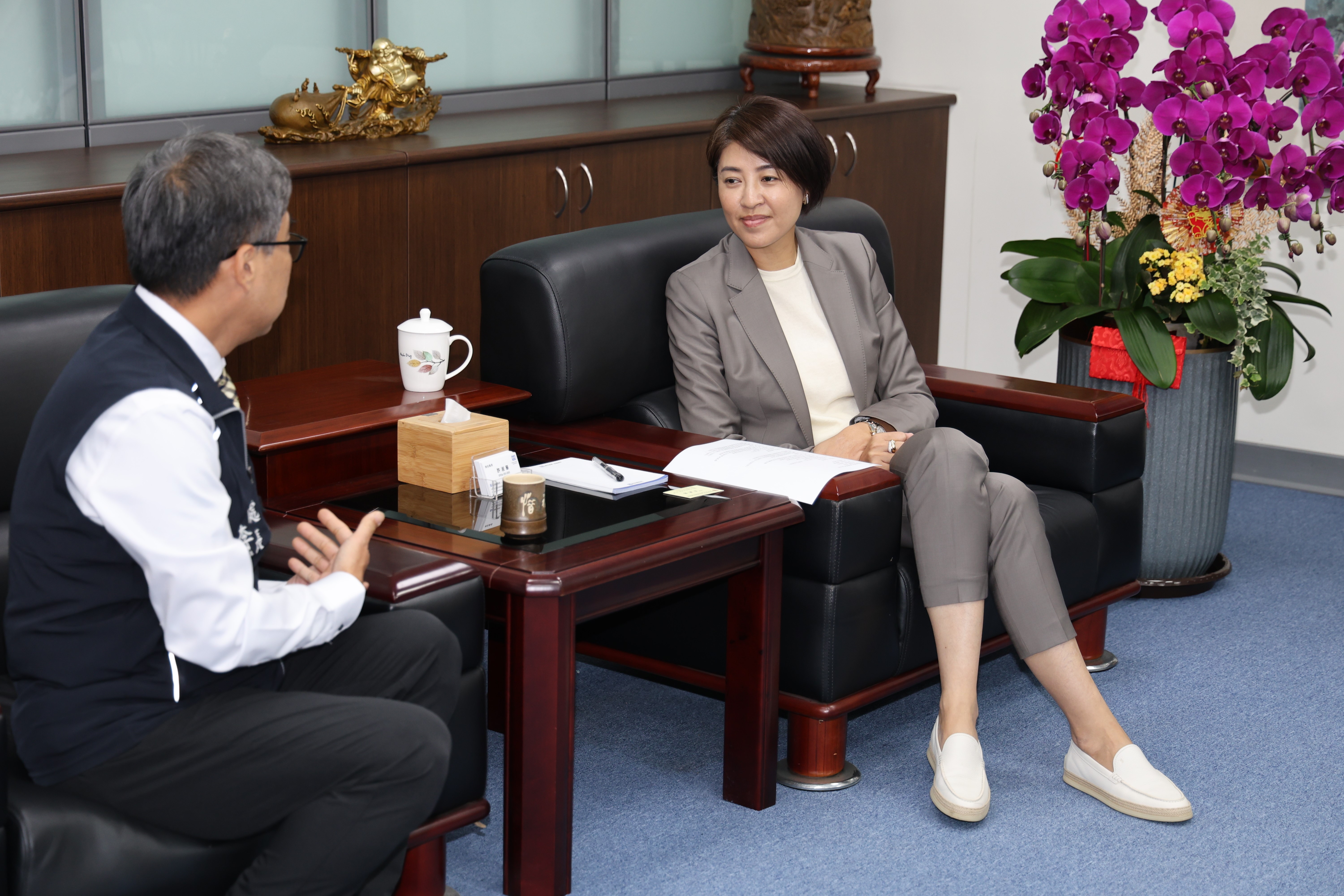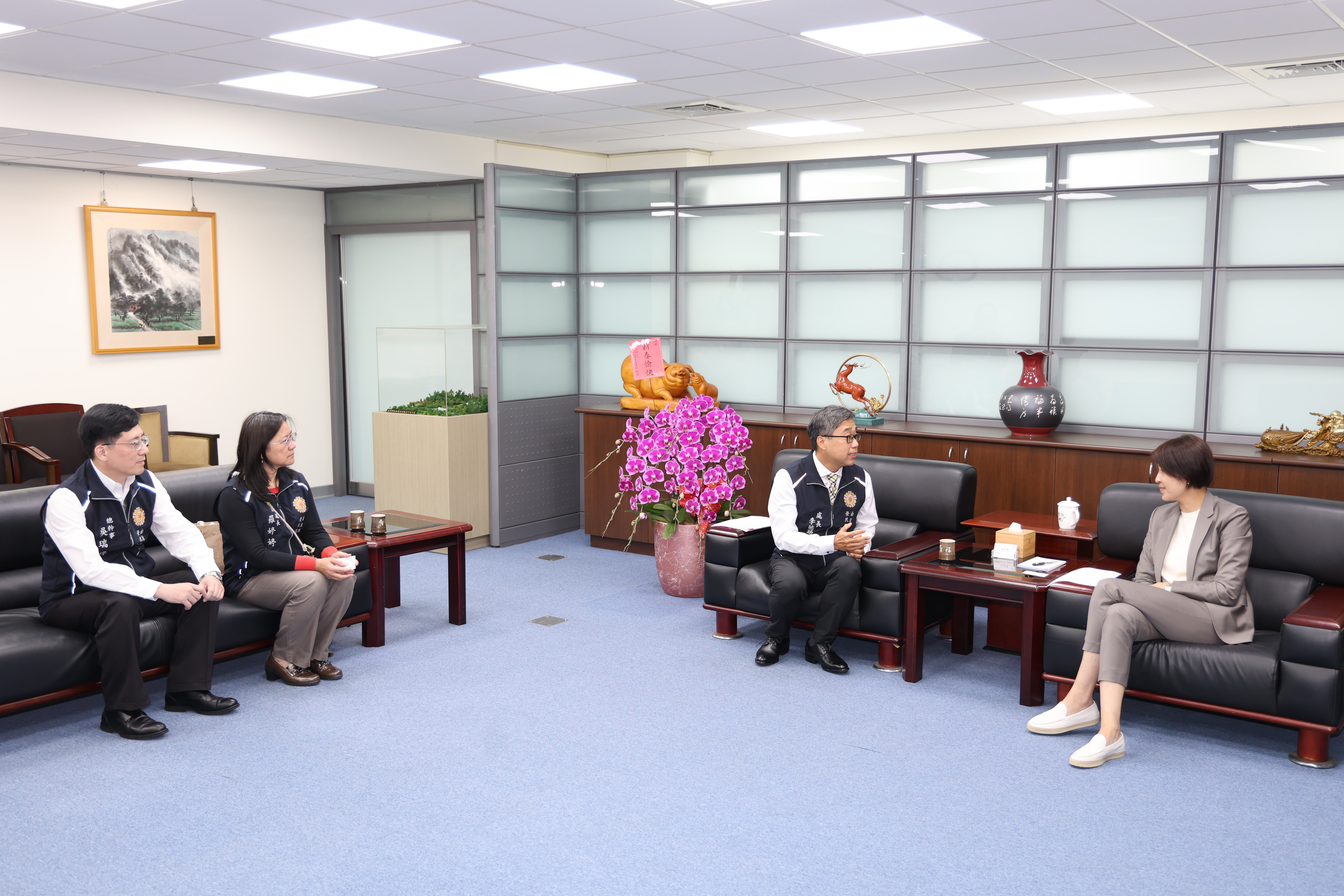 會面一開始,許淑華縣長首先向李處長表示歡迎之意,並在民政處長林琦瑜的陪同下,雙方就各項服務工作展開意見交流。李處長表示,目前南投縣榮民及其眷屬人數約2萬餘人,榮服處服務照顧的工作與縣府團隊合作密切;其中與民政處較為相關的有國軍因公殞命遺族、義務役傷殘官兵的關懷照顧等。縣府在社會救助、長期照顧服務、獨居高齡者關懷訪視及社區支持體系建構等面向,皆與榮民服務處保持密切橫向聯繫,提升整體服務效率與品質,讓有需要的榮民及眷屬能獲得妥善照顧。有關義務役傷殘官兵的關懷與照顧,民政處長林琦瑜表示,縣府會視個案需要安排替代役男定期前往陪伴與服務,並協助連結相關資源,減輕家庭負擔,此外,年節也會安排關懷慰問活動。