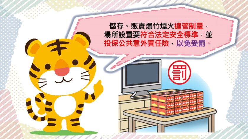 因爆竹煙火含火藥成分,大量違規囤積爆竹煙火如發生火災、爆炸事故,易導致人命傷亡,切勿違規儲存、販賣爆竹煙火,避免發生危險。
