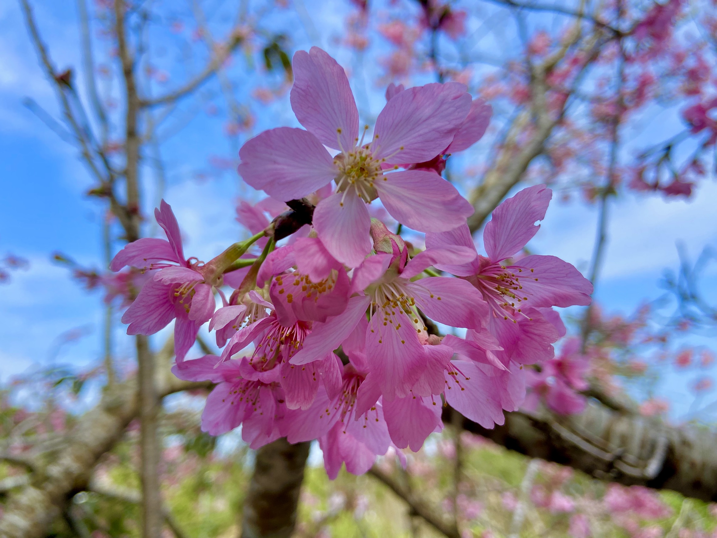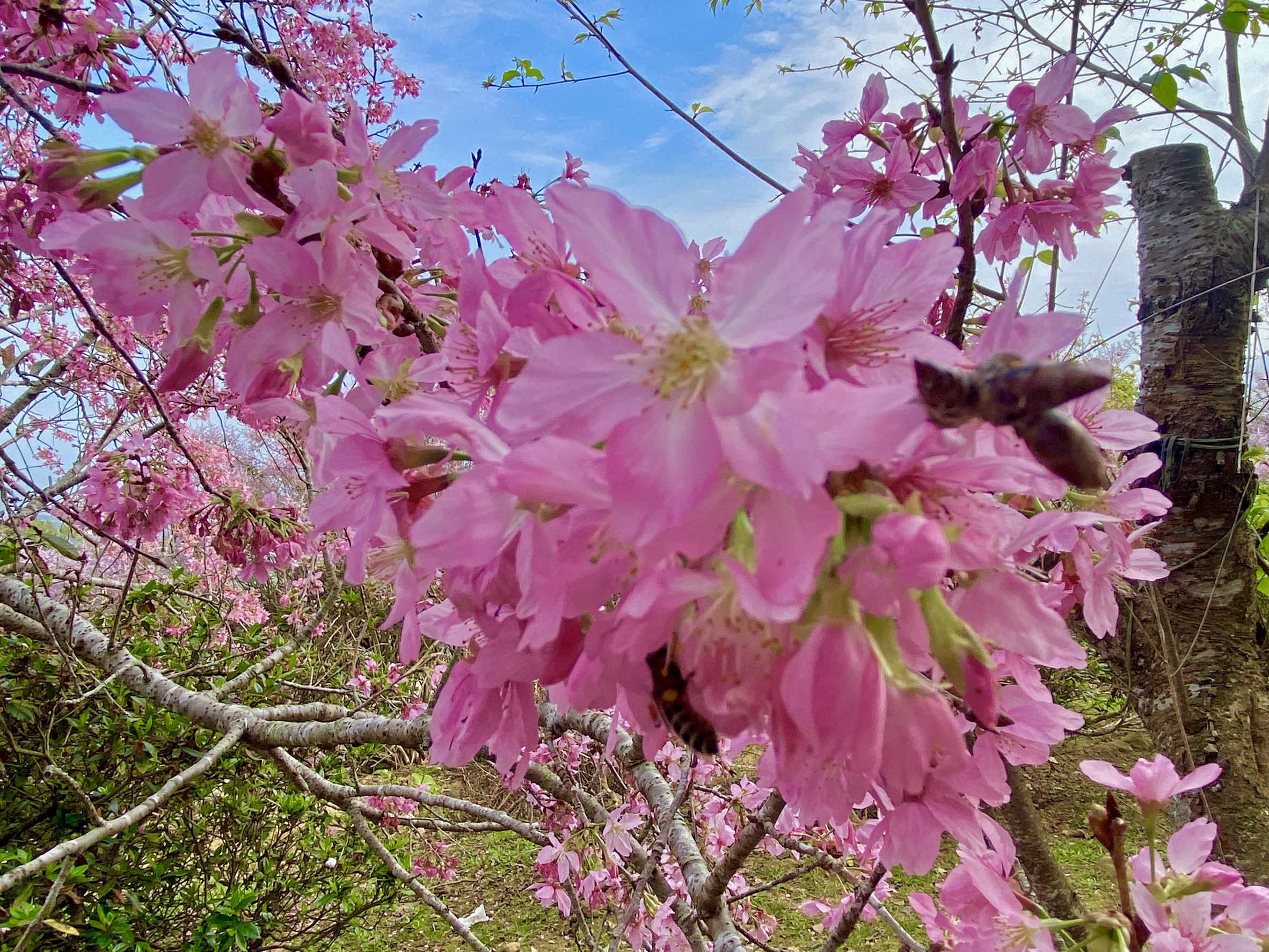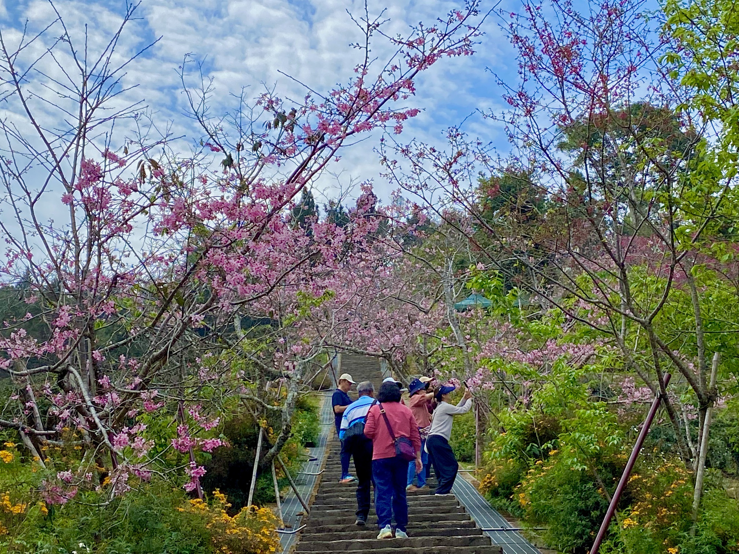 園台大茶園園區櫻花以 河津櫻、山櫻花、八重櫻等多種品種構成,沿著園區的 333 階步道形成浪漫的 櫻花隧道,是今年賞櫻的主要軸線。目前園區富士櫻和八重櫻接近盛開,櫻花步道的河津櫻6成左右,教育中心斜坡上去的河津櫻也開8成,另外園區的麝香木正在盛開。隨著氣溫回暖逐步進入盛開階段。