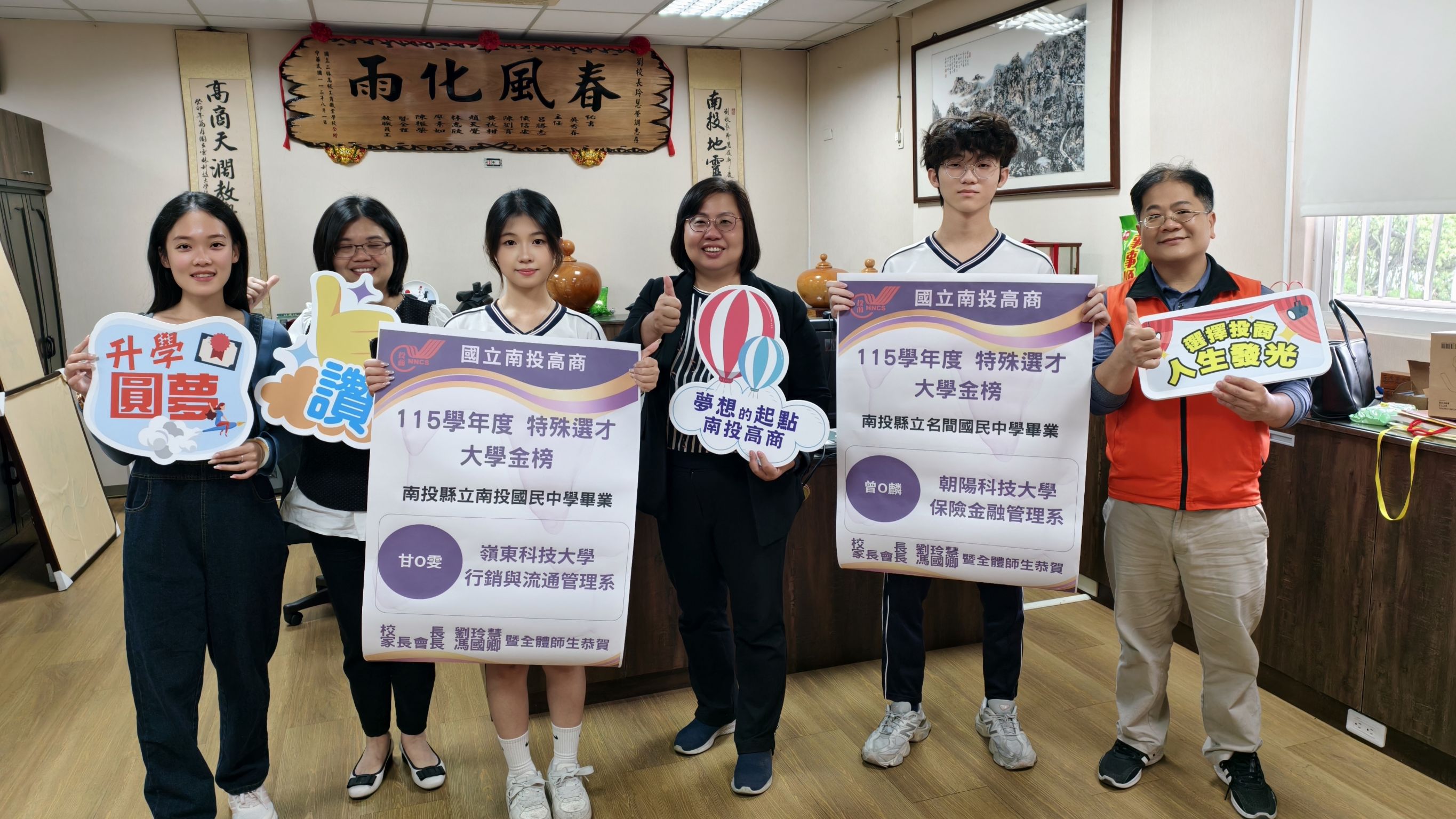 圖一南投高商校長劉玲慧(中)與錄取特殊選材的商經科甘與曾同學、教務主任(左二)、商經科主任(右一)、導師(左一)一起合影。(南投高商提供)