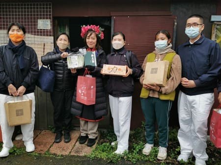 志工逐戶送達祝福禮,不在家的住戶,就請社區管委會主委代為轉送。感恩祝福會圓滿結束,鄉親自發準備蔬食午餐和熱食,在寒冬中與志工一起溫暖彼此。