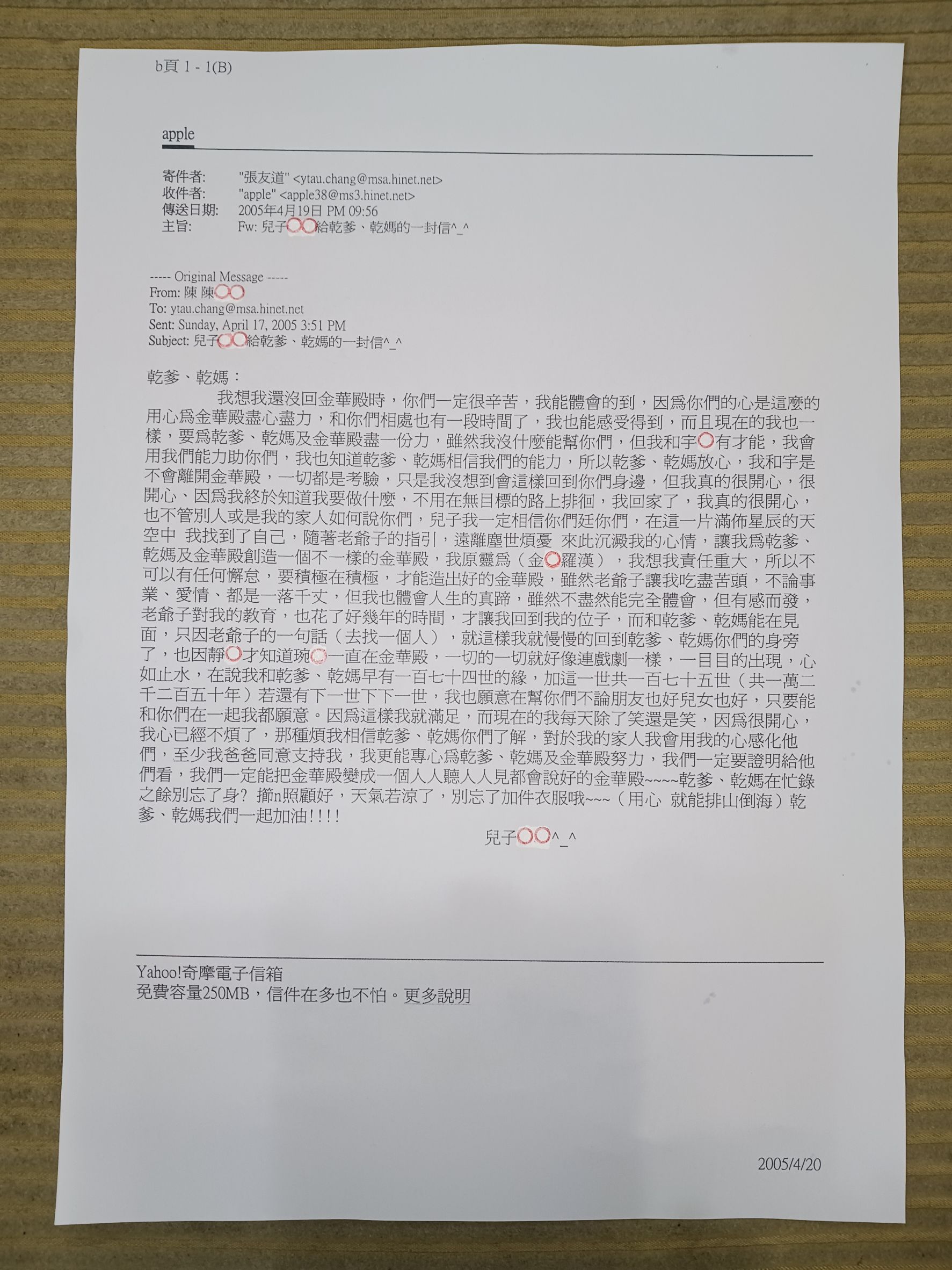 這是一封2005(94).04.17.(乙酉.03.09.)星期日下午15:51,乾兒子陳OO,寄給乾爹張友道、乾媽王金珠一封千真萬確的email。