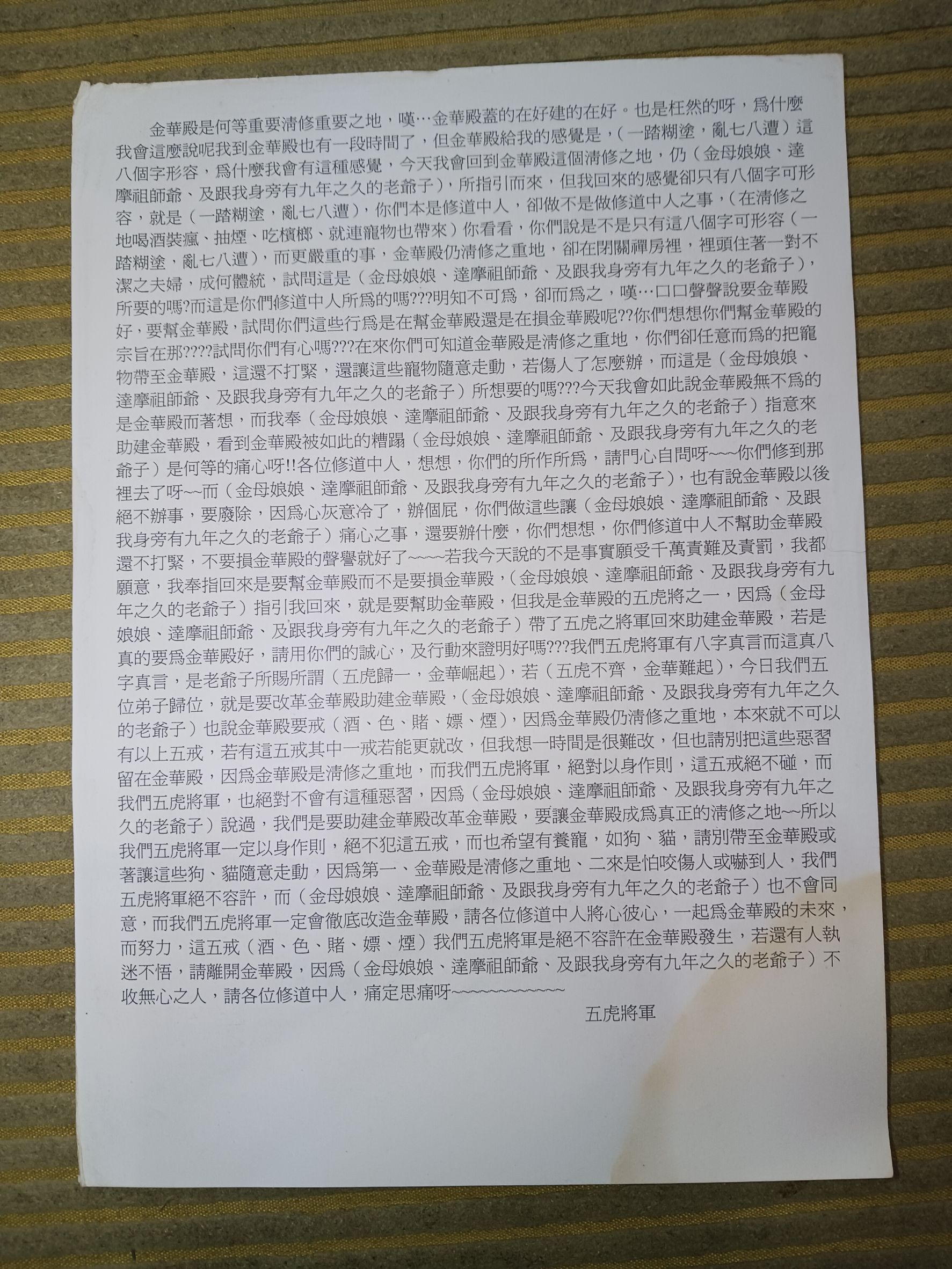 『希望乾兒子陳OO你的言行所為,能對得起自己的良心,能對得起「金華殿」主席 瑤池金母娘娘、及眾聖、神、仙、佛!!!』
