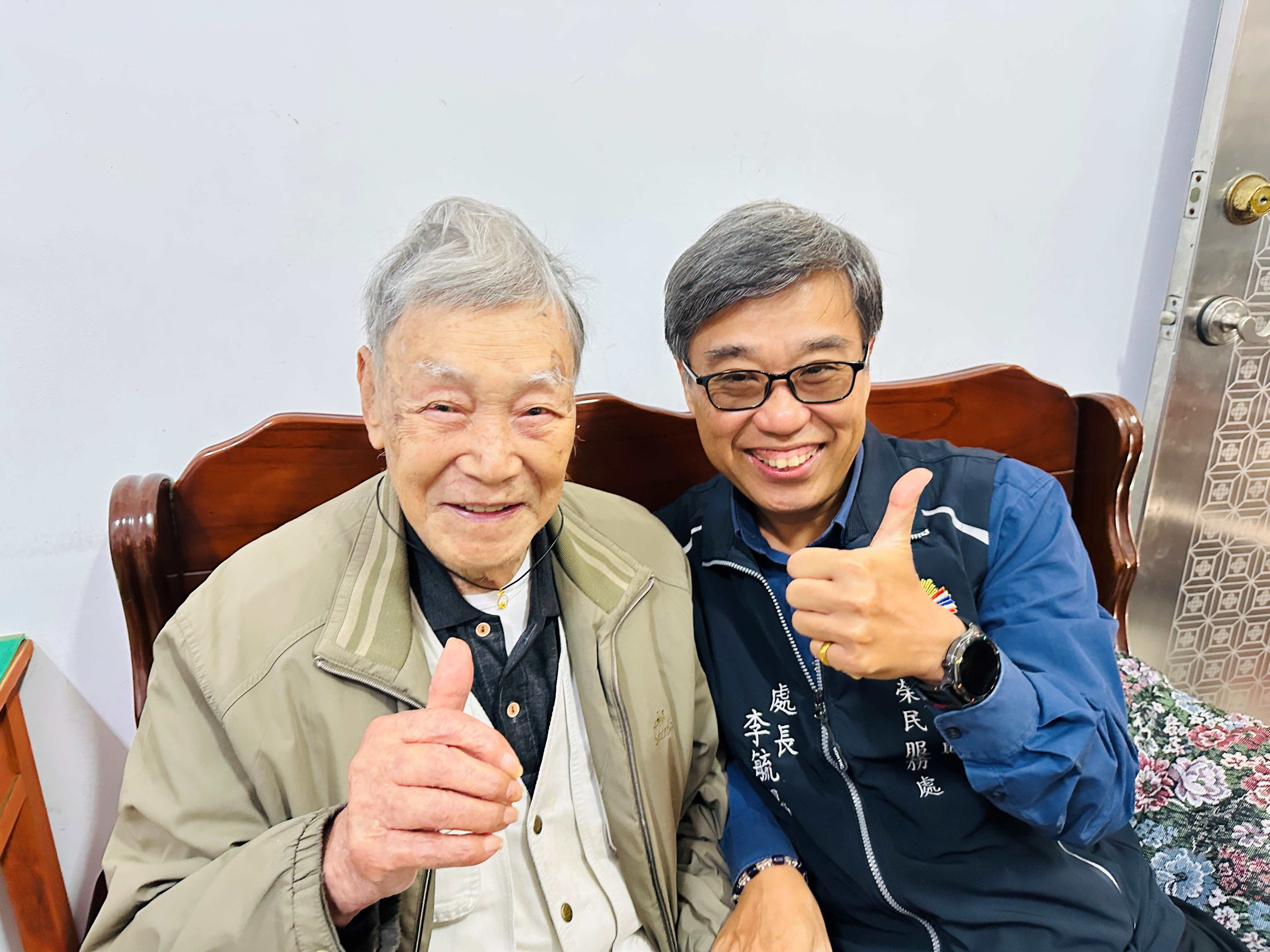 圖二南投縣榮服處李毓錫處長(右)祝賀榮民人瑞唐伯伯(左)百歲嵩壽。(南投縣榮服處提供)