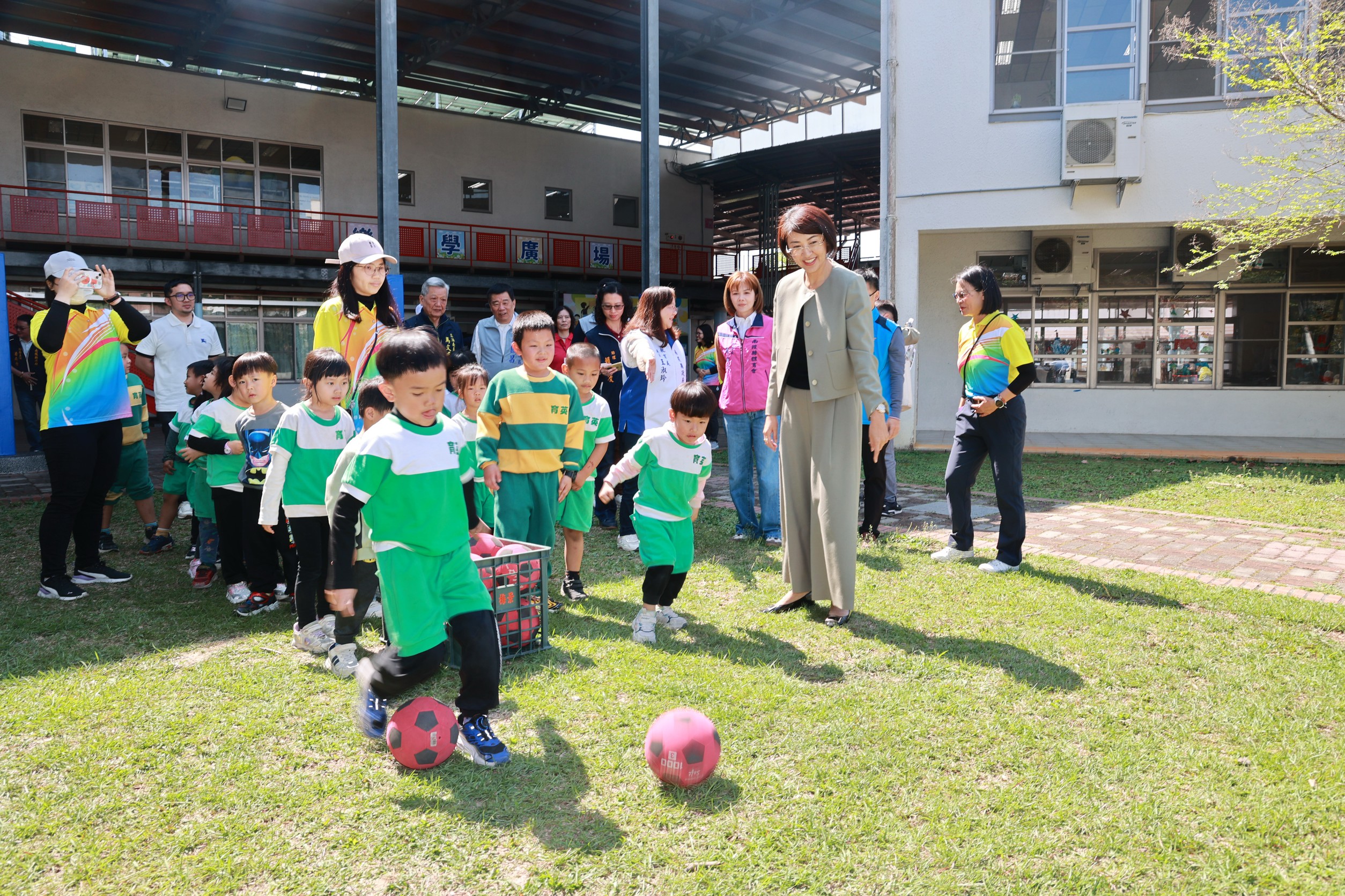 圖三許縣長觀賞幼兒踢足球,開心寫在臉上。 ( 縣府提供)