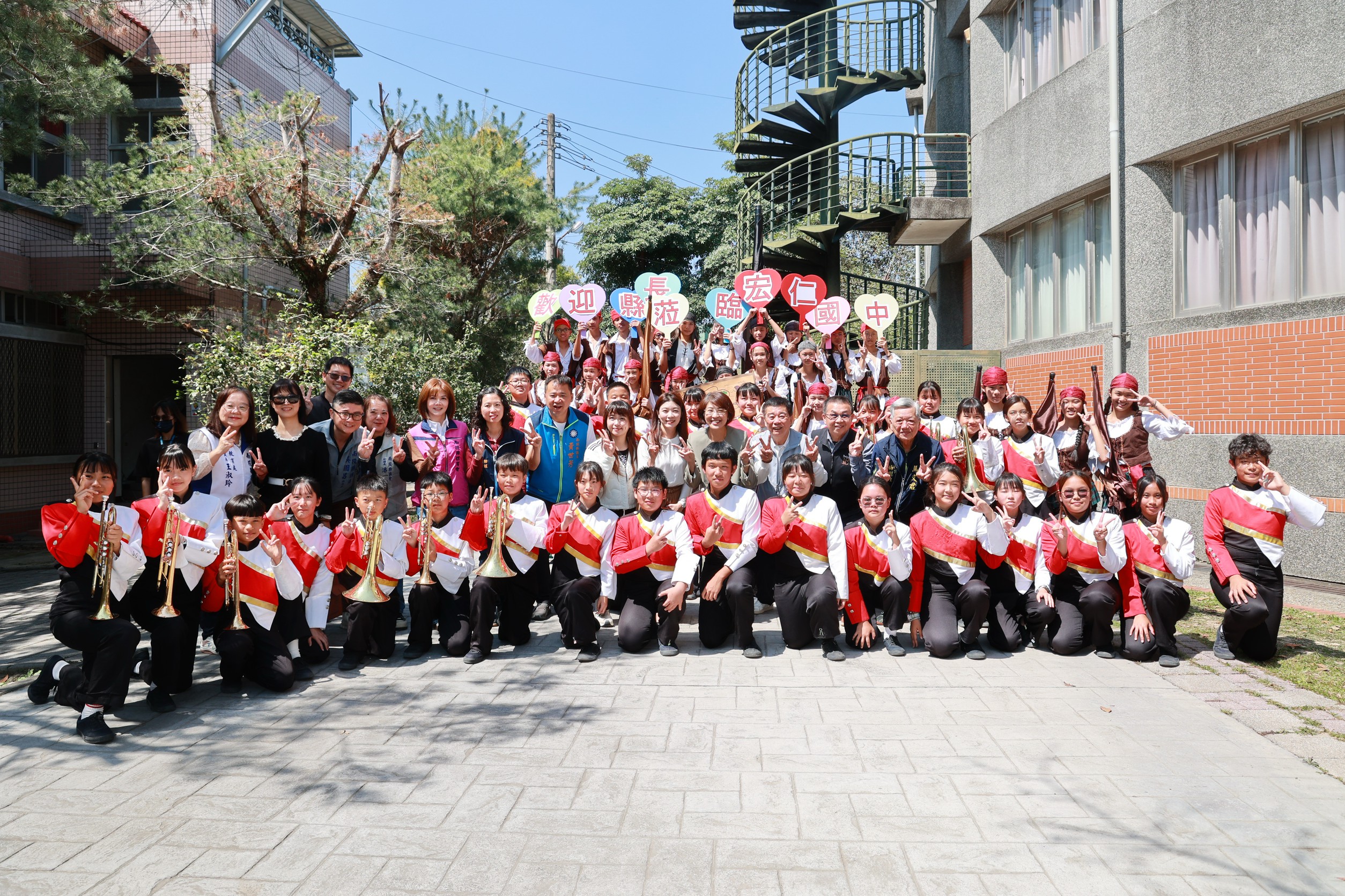 圖二許縣長走訪宏仁國中傾聽校方改善校園需求並宣布學校行政組織將擴編合影( 縣府提供)