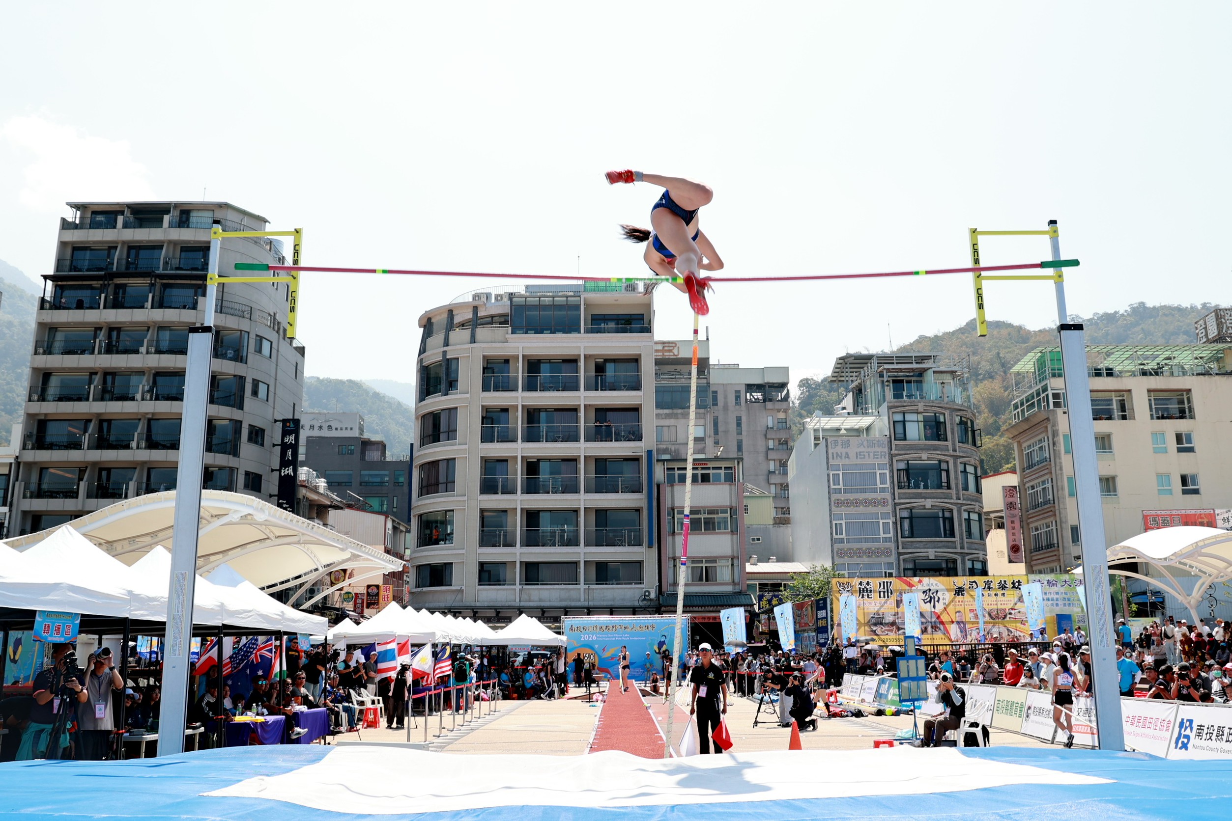 2026南投日月潭國際撐竿跳高邀請賽今(22日)在伊達邵碼頭盛大登場,來自美國、英國、法國、日本、韓國等14個國家地區的68位世界級選手,在湖畔展開激烈競技,湖光山色,吸引遊客駐足加油打氣。國手吳彥翰不負眾望,挑戰5公尺40破全國紀錄,再度晉升高度,成功跳過5公尺50,再刷新全國紀錄,同時達標名古屋亞運選手資格。