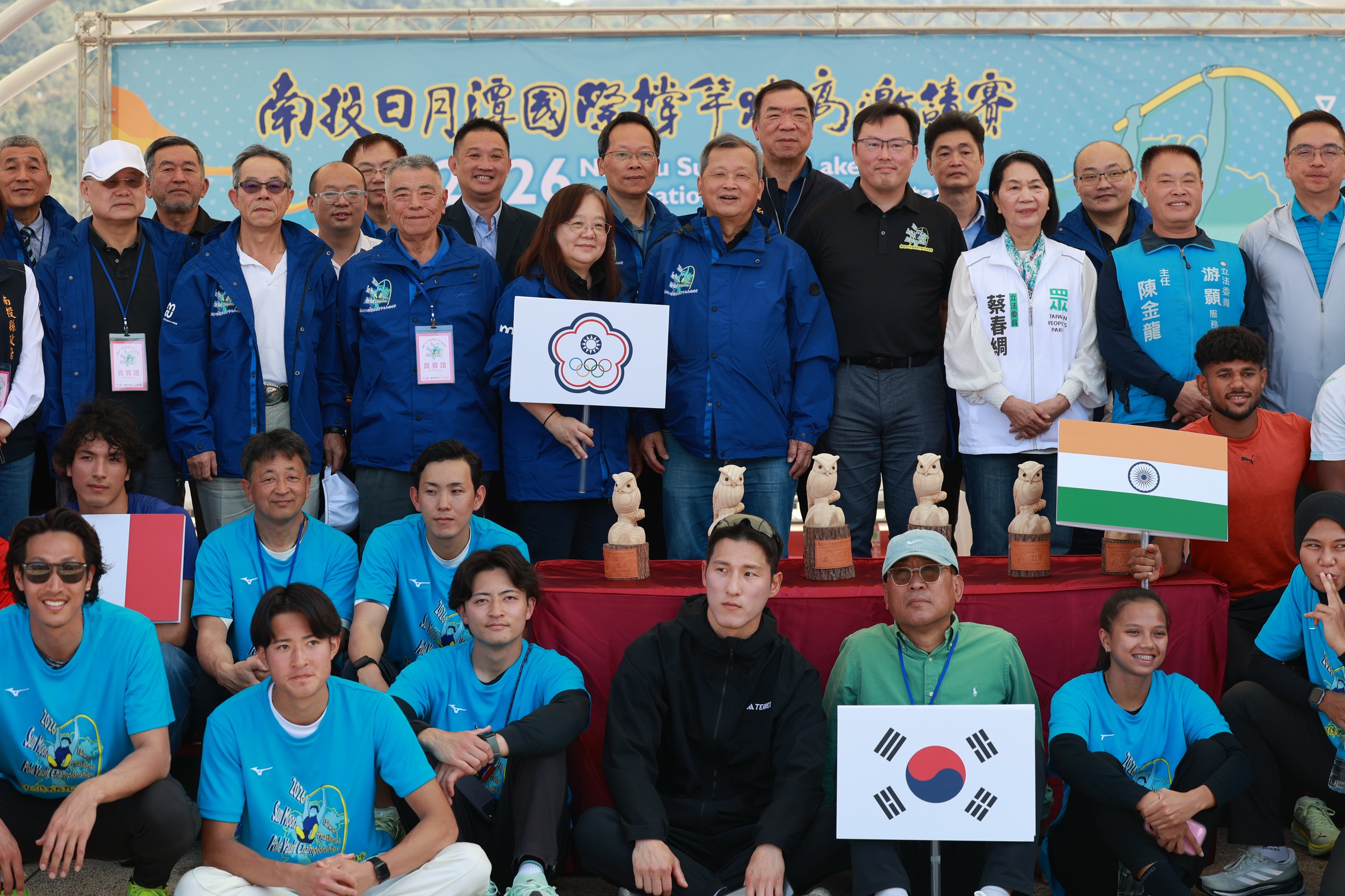 圖一 2026南投日月潭國際撐竿跳高邀請賽今(22日)在日月潭伊達邵碼頭盛大登場,來自美國、英國、法國、日本、韓國等14個國家地區的68位世界級選手,在湖畔激烈競技,王副縣長代表許縣長(右5)、及縣府教育處長王淑玲(右6)二人歡迎全體選手大合影。( 縣府提供)