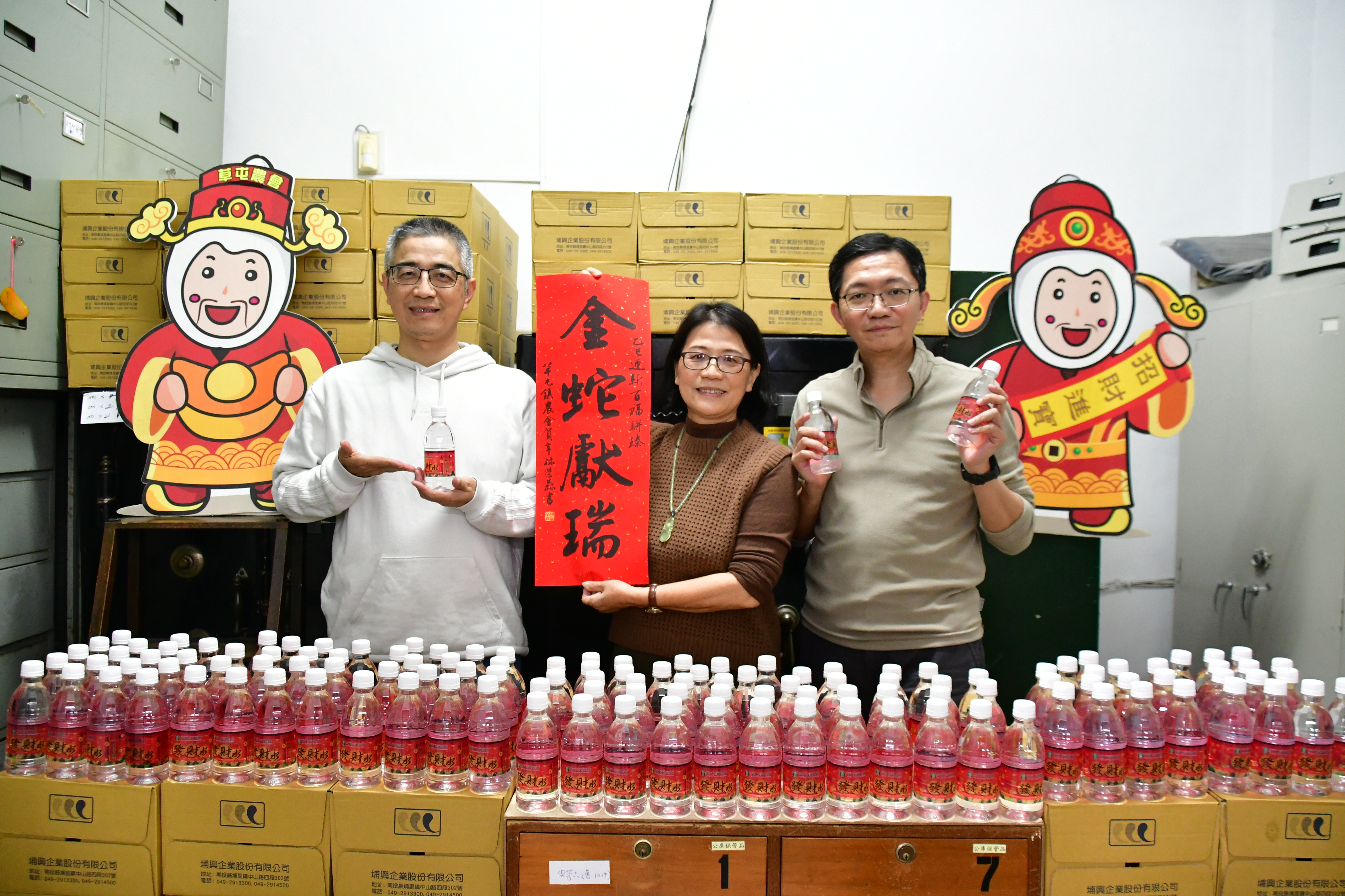 圖二草屯農會總幹事 簡世泓(中)親自清點 1688瓶發財水,存放進金庫。 (草屯鎮農會提供 )