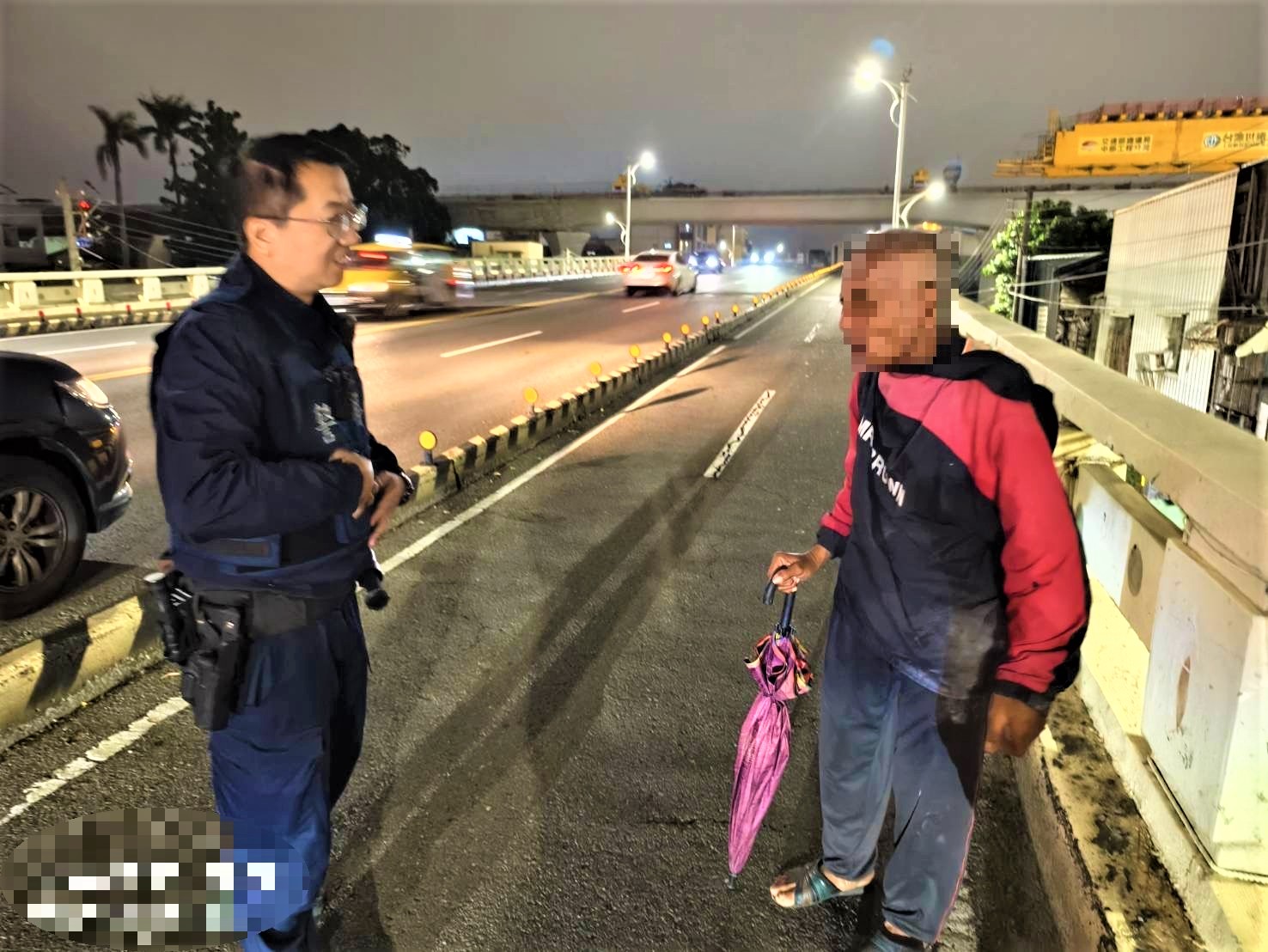 陳、黃等2員獲報抵達現場,發現老翁行動緩慢獨自走在陸橋上的機慢車道上,由於該陸橋未設置人行道可以行走,行駛經過的機車見該老翁紛紛閃避,增添許多危險;員警先以巡邏車做為警示,防止機慢車通行危險,並陪同老翁走下陸橋安全處,關心詢問年籍資料,老翁向警方說他要回家,但不知要從何處去。