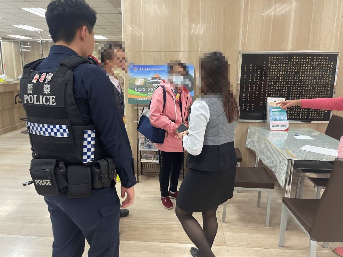 〔記者呂明鴻/嘉義市報導〕嘉義市政府警察局第一分局長榮派出所警員李韋葶、陳文彥日前擔服巡邏勤務時,接獲文化路嘉義市第三信用合作社報案指稱,有民眾欲臨櫃匯款新台幣30萬元,經銀行人員關懷詢問察覺有異,疑似遭到詐騙,因此請警方到場關心查訪。