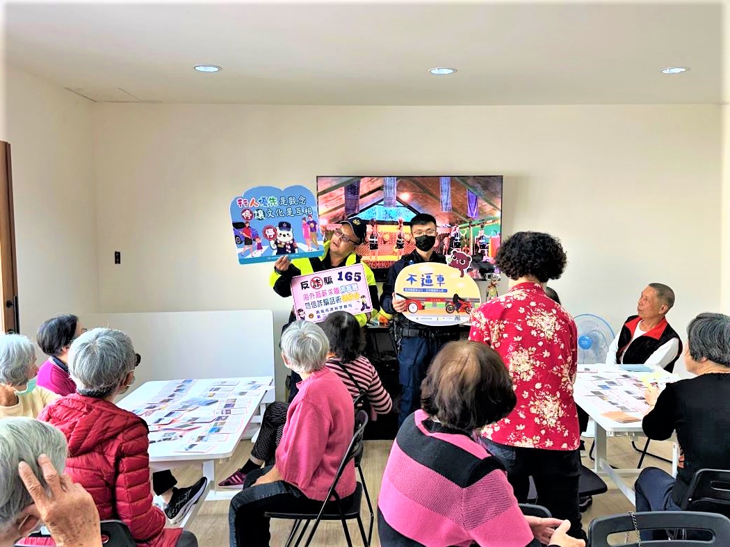 交通方面警方特地對在場的長者們加強宣導今年主題「行人穿越馬路應走斑馬線」、「轉彎應打方向燈」、「騎乘機車應戴安全帽」、「無照不上路」及微型電動二輪車已正式納管,若有尚未領牌的電動車切記不可騎乘上路,務必在完成投保強制險及掛牌後才可行駛,確實遵守法令修正新規定,才能保障自身及其他用路人行的安全。在宣導過程中,員警們透過生動言詞解說搭配發放DM宣導文宣使民眾能以輕鬆愉快的方式了解宣導內容。