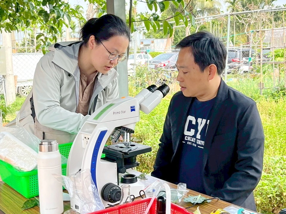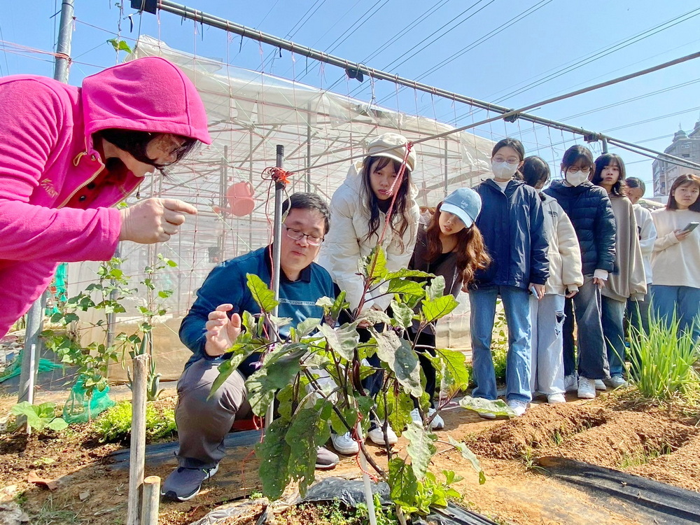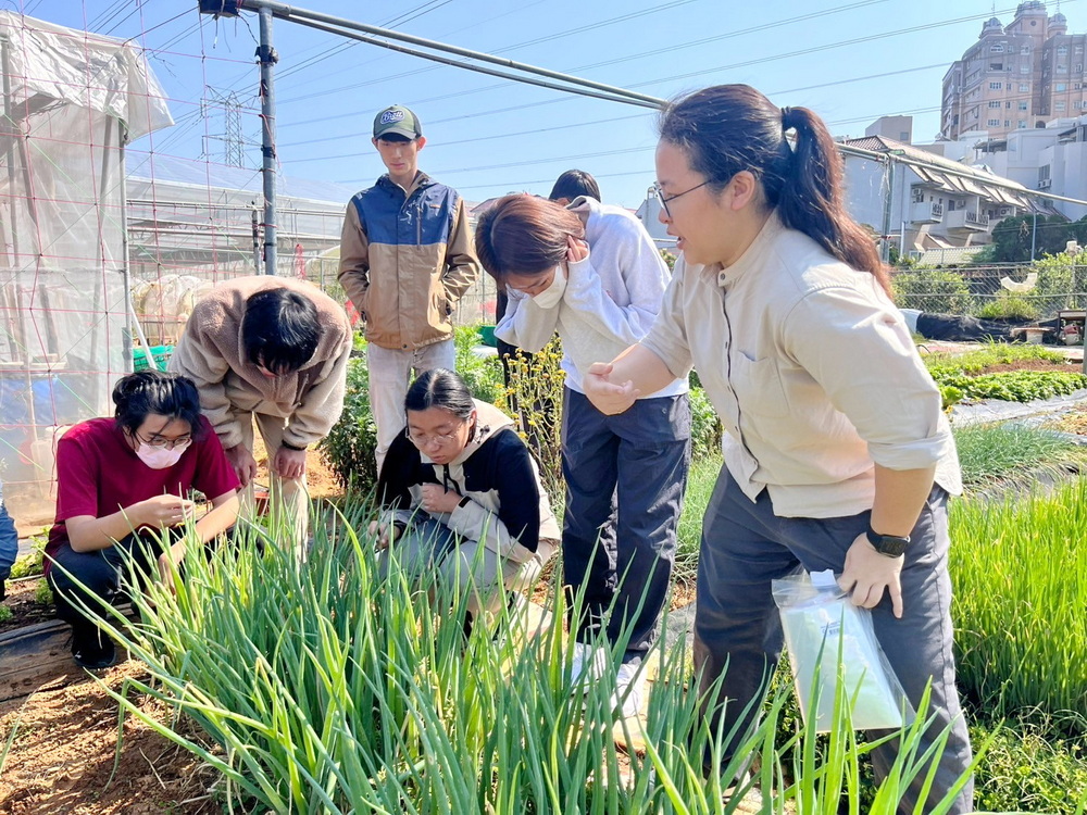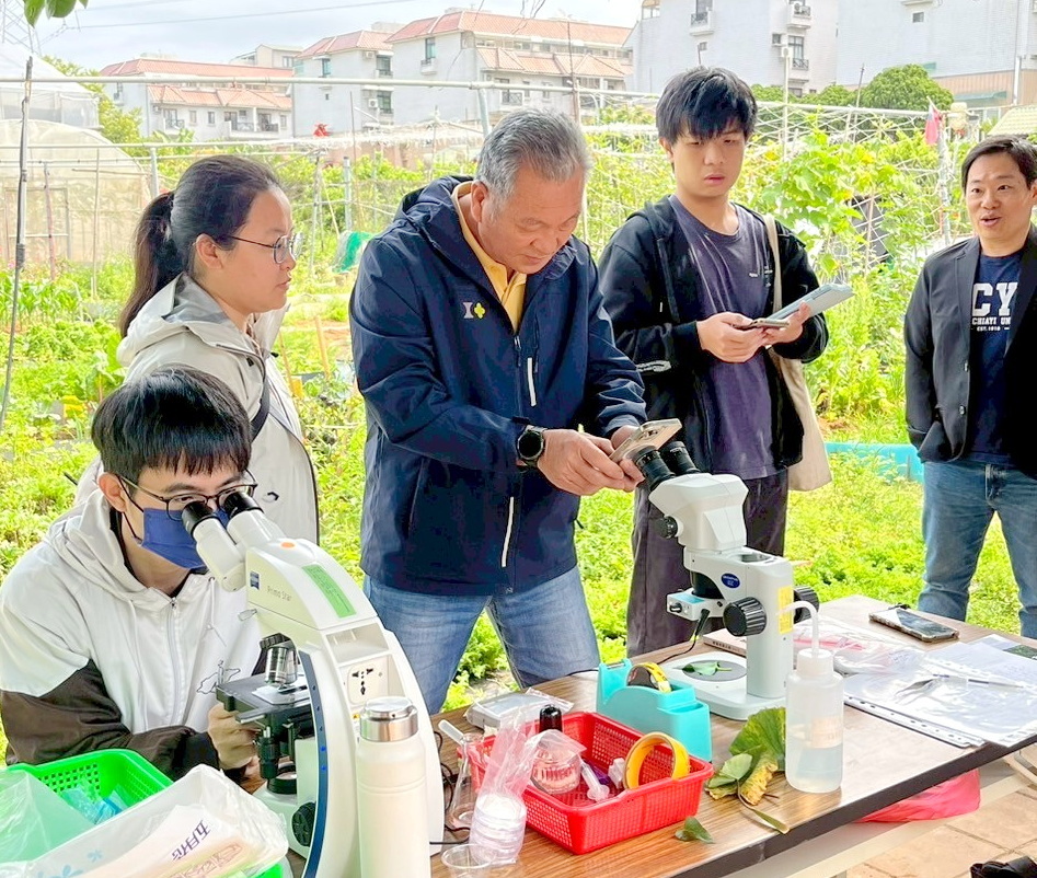 為辦理妙手虫森「綠意守護者」活動,林彥伯助理教授及陳佩君助理教授首先帶領嘉大景觀學系、植物醫學系、森林暨自然資源學系及生物資源學系等跨院系學生走進長竹市民農園田間,讓學生實地認識各種作物害蟲及病害,並解說有機栽培田區耕作模式和病蟲害防治諸多特點。