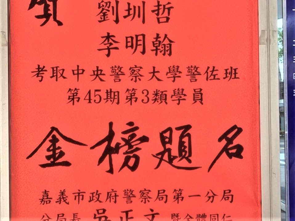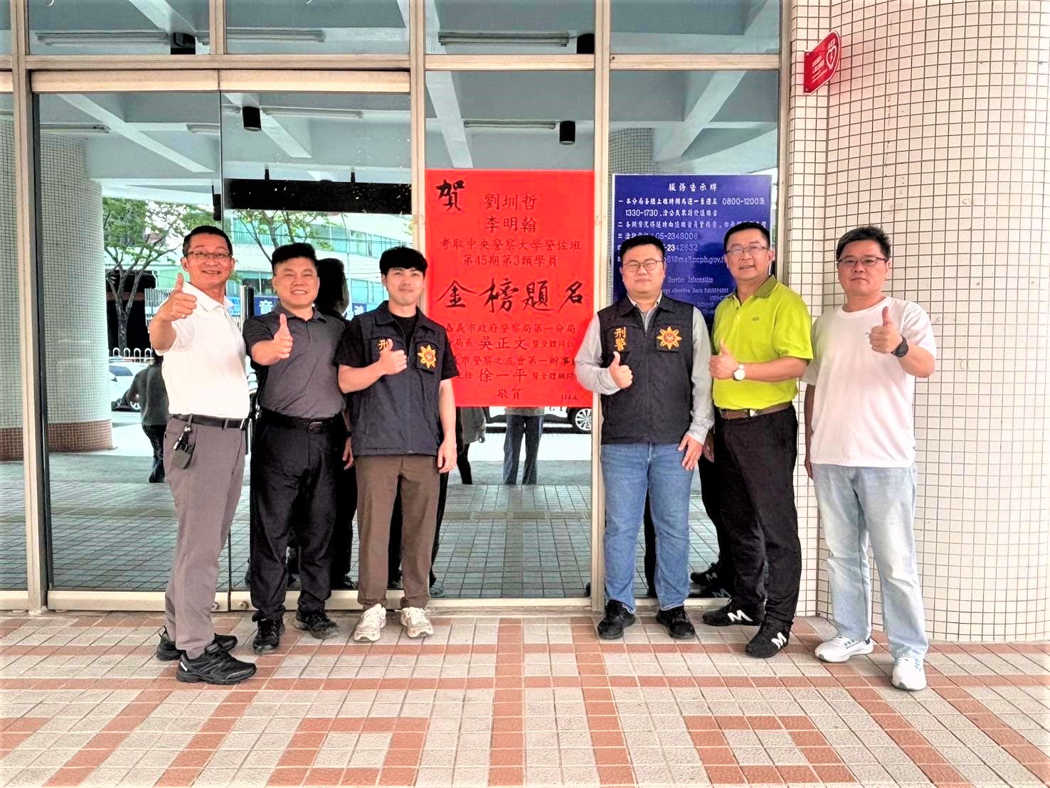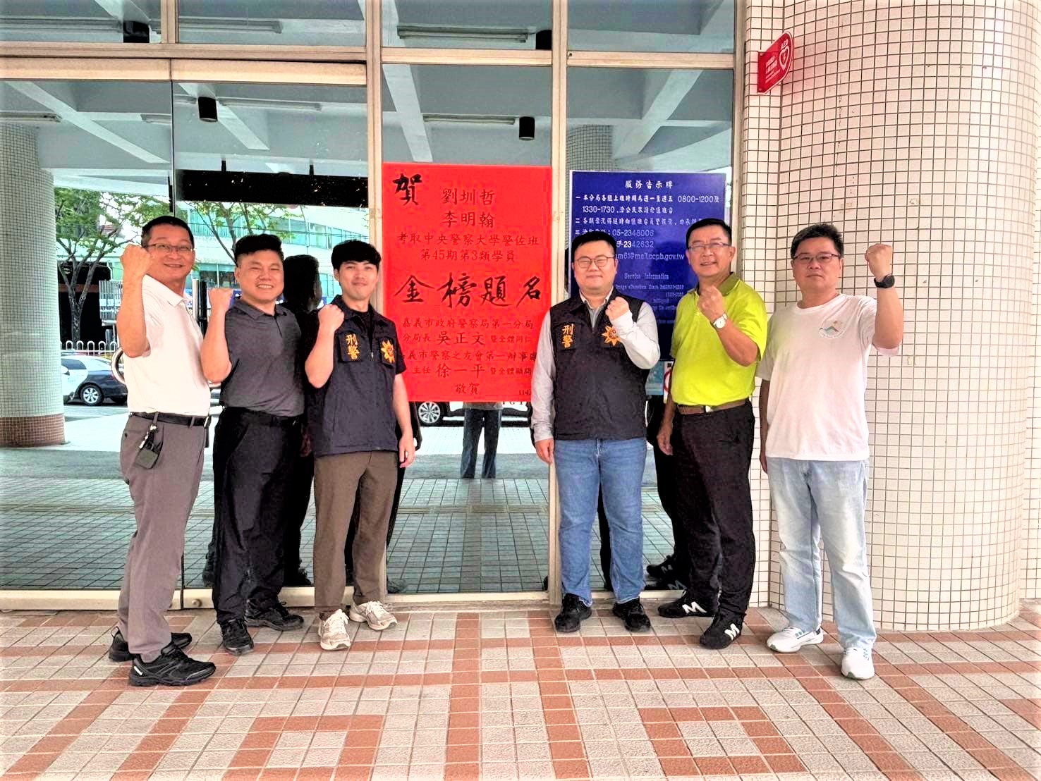 〔記者呂明鴻/嘉義市報導〕嘉義市政府警察局第一分局再傳捷報,兩名表現優異、認真敬業的刑事警察人員—小隊長劉圳哲與偵查佐李明翰,於繁重勤務中,仍努力進修,且雙雙考取中央警察大學警佐班第45期第3類組,為市警一分局爭光,也為嘉義警界再添光彩。
