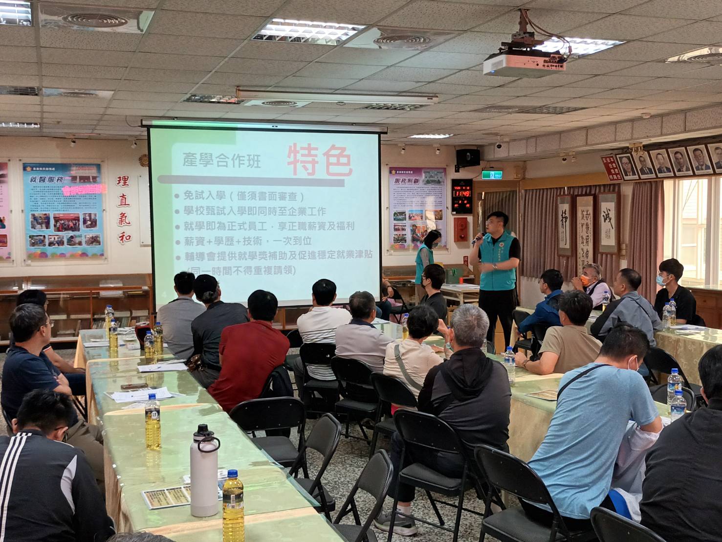 輔導會並說明產學、產訓合作方案,產學合作學校有北中南部知名的文化、城市、致理、萬能、勤益、虎尾、崑山及正修等15所大專校院,目前也鏈結了友達光電、豐田汽車、燁聯鋼鐵、燁輝企業、大立光…等十餘家產訓合作專案的企業廠商,對退除役官兵助益良多。蘇簡任視察表示輔導會現行就學就業職訓工作的政策推動,都是為了協助退除役官兵順利轉銜進入職場,提供各項就學就業職訓權益措施及補助方案,籲請與會人員都能善用資源,妥為規劃退後職涯發展,在會中肯定了榮服處對於說明會的來賓邀請跟期程安排,也表達慰問之意。