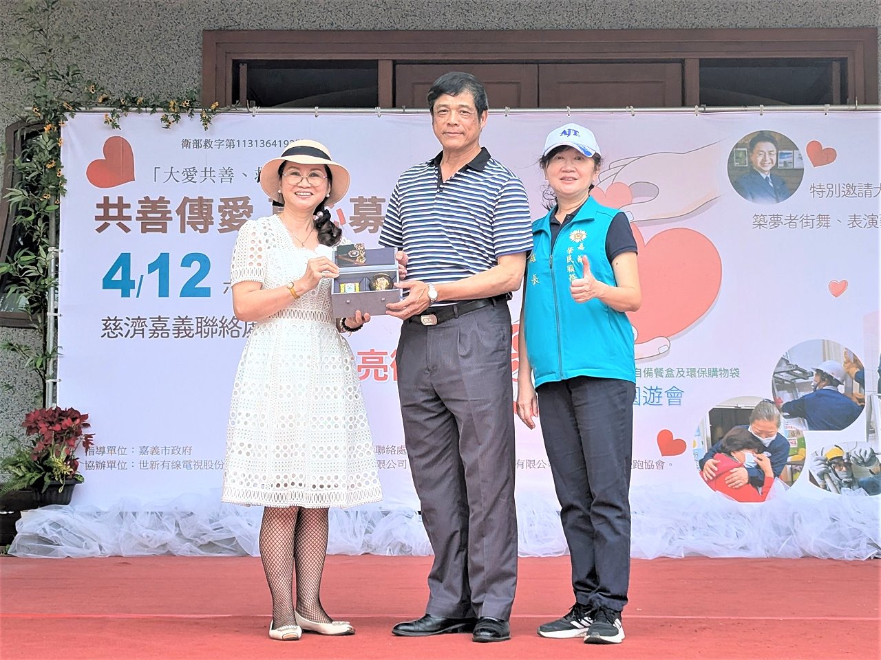 〔記者陳允得/嘉義市報導〕嘉義榮民服務處與欣欣水泥股份有限公司,近日攜手參與慈濟基金會嘉義聯絡處主辦「點亮微光、讓愛飛揚」園遊會,由工作同仁與榮欣志工設攤義賣,現場熱情招呼來往民眾,以實際行動支持公益活動,慈濟基金會也邀請許淑菁處長與郭先琛董事長上台敲響愛心鑼,一起共善傳愛。
