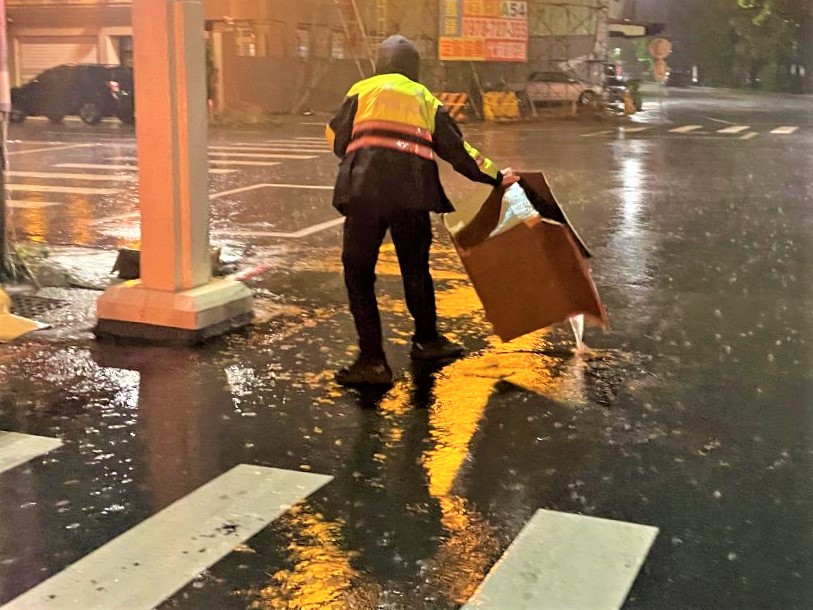 〔記者李芷妍/嘉義市報導〕嘉義市政府警察局第二分局公園派出所警員邱峮豪及劉美伶日前執行巡邏勤務時,因深夜下起豪雨,加上狂風不斷,員警加強轄區巡邏,預防災害發生,而當行經維新路段時,遠遠就看到路口疑似堆放幾個紙箱,員警立即主動上前查看。