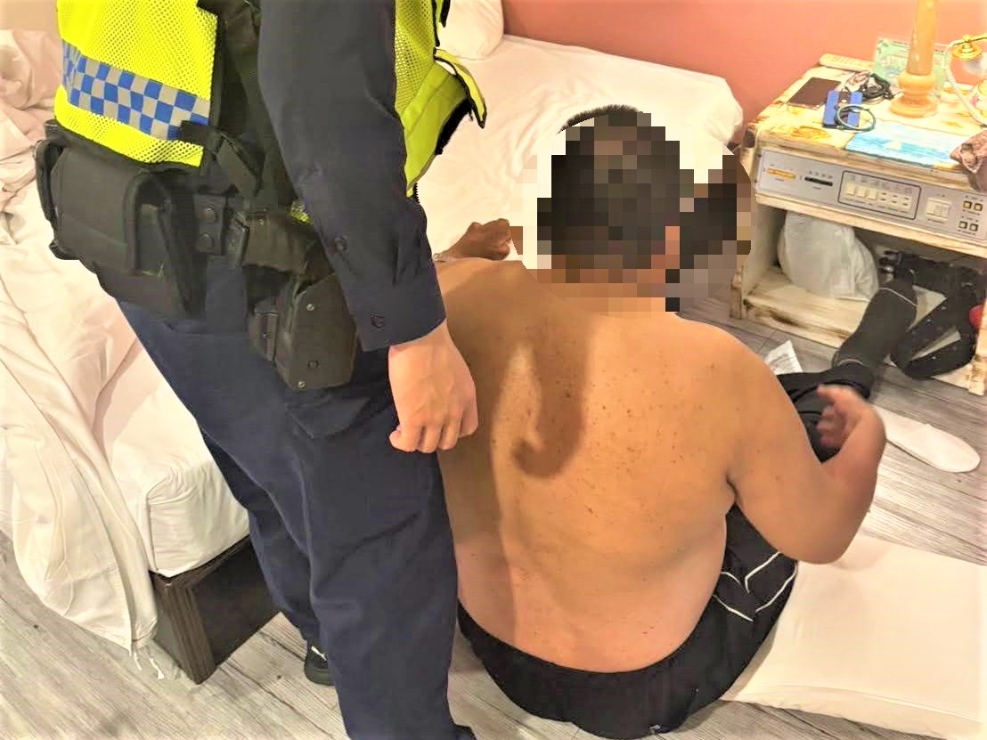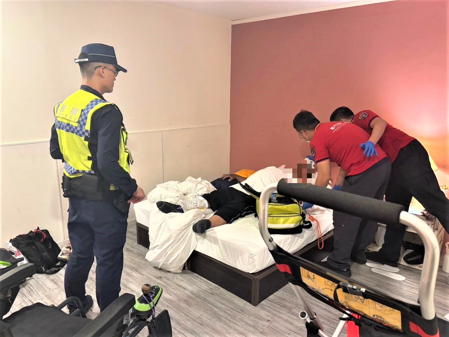 因黃姓男子體型魁梧,加上年歲已高,導致無法自行站起,同行的外籍看護雖試圖將其攙扶回床,但因體力不足無法成功,擔心黃男可能因此受傷,便急忙報案請求緊急協助;經員警與救護人員迅速趕赴現場進入旅館房內查看,只見黃男神情痛苦坐臥於地板,雖然意識清楚但因跌落時力道過猛,暫時無法動彈,身旁的外籍看護神色焦急不知所措,經救護人員評估黃男身體狀況後,小心翼翼地配合支撐身體協助轉移重心,才終於成功將黃男安全抬回床上休息。