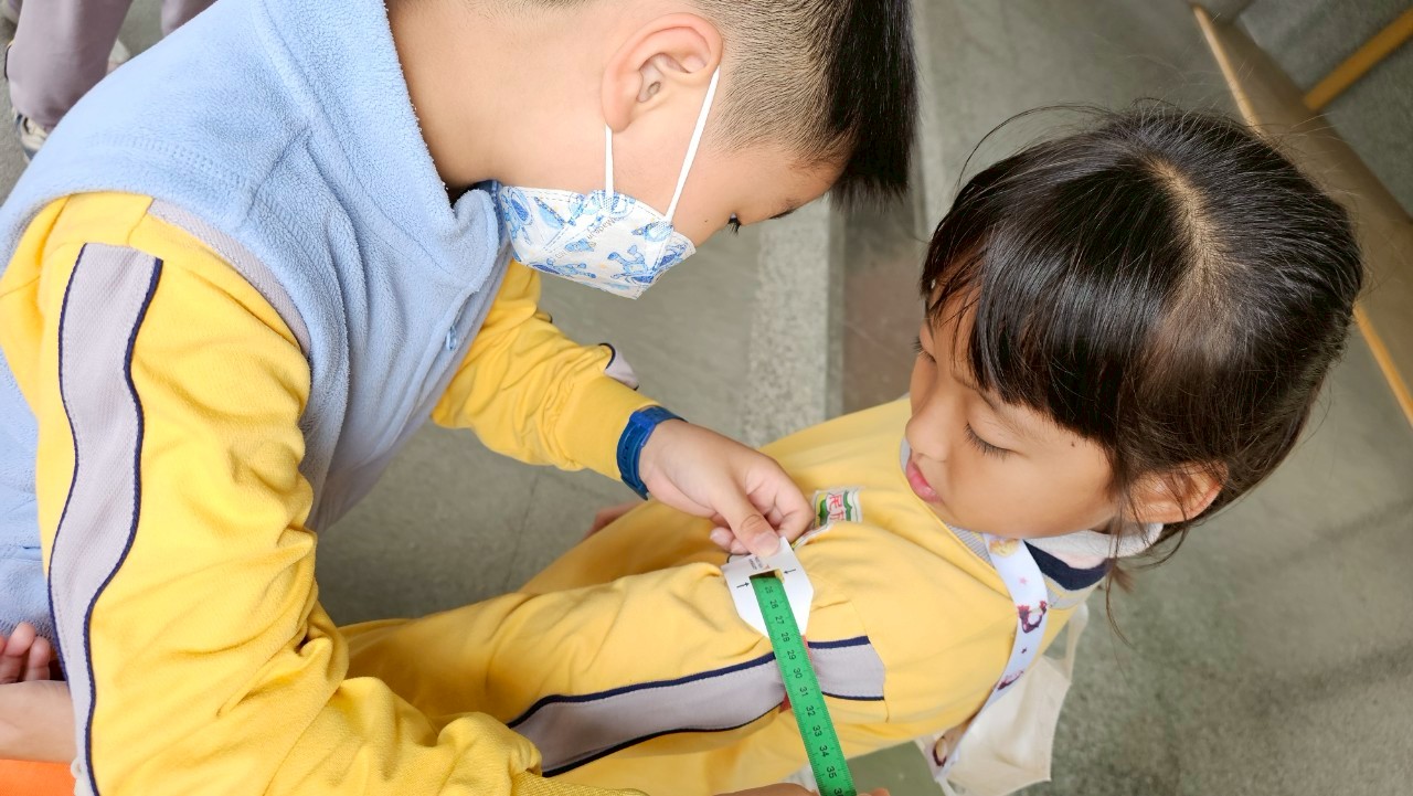 活動現場設有由台灣世界展望會提供的「上臂量尺闖關體驗」,這是偏遠地區與難民營中常用來評估幼兒營養狀況的簡易工具。孩子們透過實際比對手臂圍度,直觀感受到飢餓對兒童生命的威脅。一位高年級學生驚訝地說:「嚴重營養不良的小朋友手臂只有11公分,跟我四根手指差不多,真的好細!」小二學生也純真地表示:「我手臂17公分,11公分真的太小了,他們一定常常肚子餓,希望我們能幫助他們健康長大。」這樣的體驗讓孩子們不僅理解營養不良的嚴重性,也在心中種下對弱勢兒童的同理與關懷,讓愛在校園中悄悄萌芽。