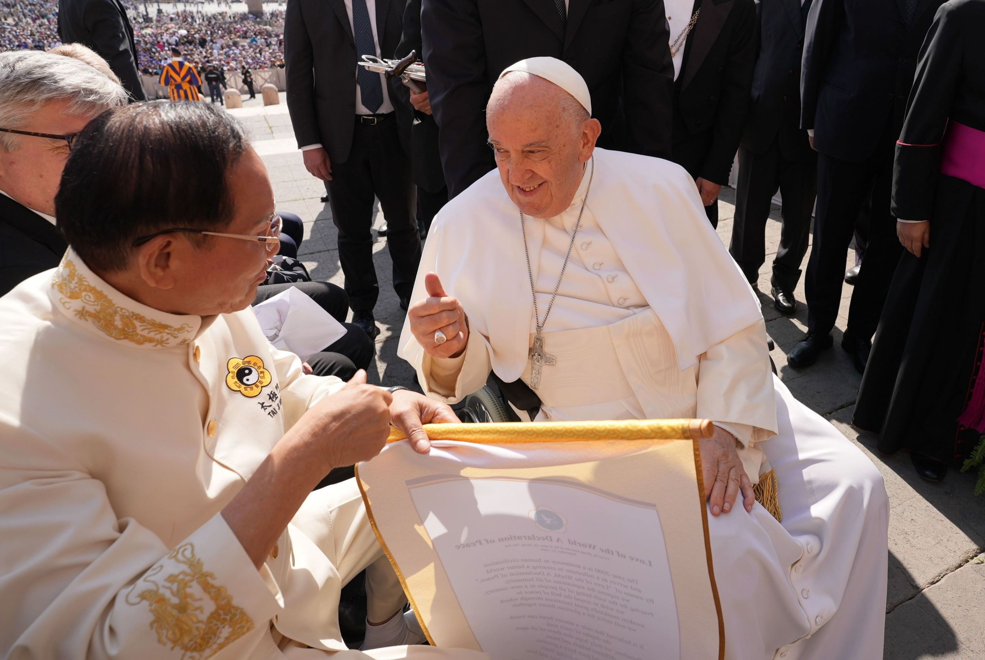 洪博士與教宗方濟各分享並致贈《世界之愛和平宣言》,教宗豎起大拇指認同肯定。
