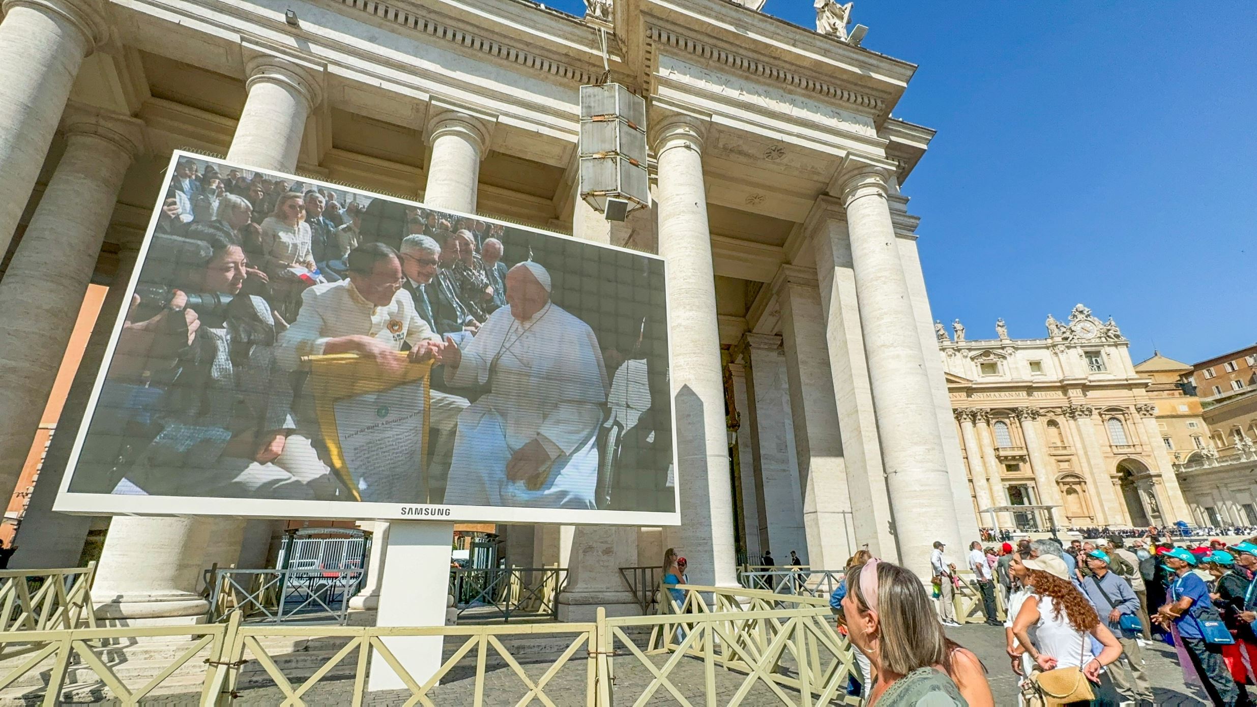 聖伯多祿廣場大螢幕正播放教宗方濟各與洪道子博士的會晤。