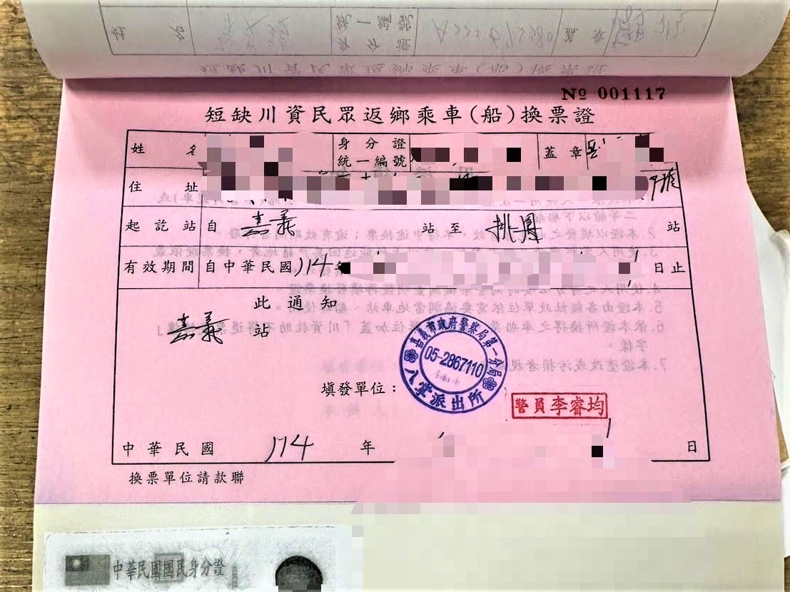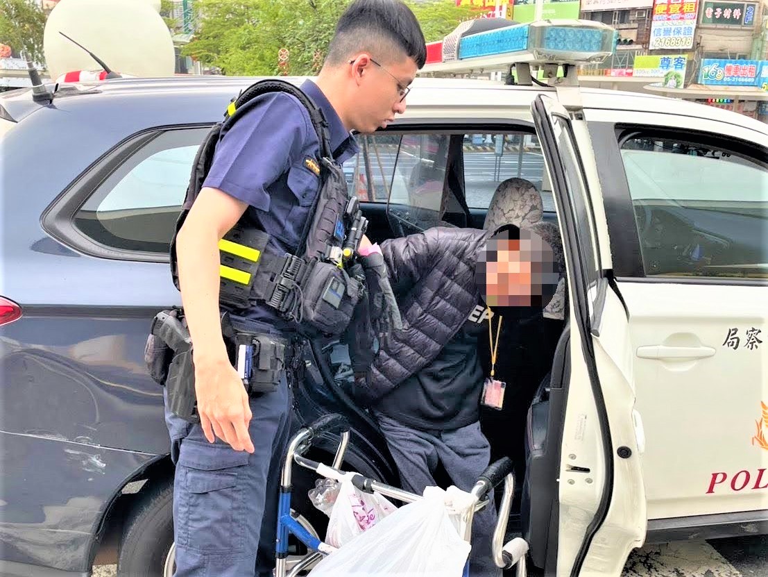 李員到場見到劉男行動不便,且身況疲憊略顯虛弱,行走必須倚靠著助行器,所幸劉男帶有身分證號碼影本,經李員查證身分無誤後,積極協助劉男申請返鄉乘車換票證,以最短時間內順利購票搭乘返程列車;李員並以巡邏車載送劉男前往嘉義車站坐車,過程中員警暖心協助上下車及搬運所攜帶的物品,劉男對員警的貼心為民服務舉動非常感動,頻頻表達感謝之意。