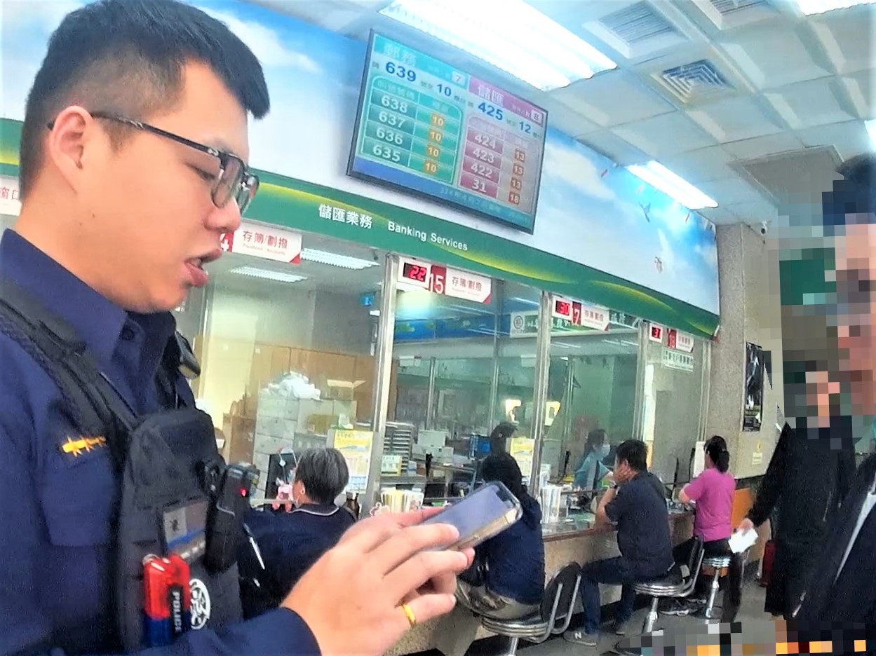 員警到場後了解報案人為王姓男子,他騎機車戴母親到郵局提領新臺幣30萬元現金,王男表示提領大額現金要處理家務,經行員溫馨提醒由於近日頻傳各類財務詐騙與搶案,請行車要小心且要注意身邊可疑陌生人,王男母子倆擔心在返家途中遭有心人士盯上,經審慎討論決定向警方請求協助護鈔以策安全。