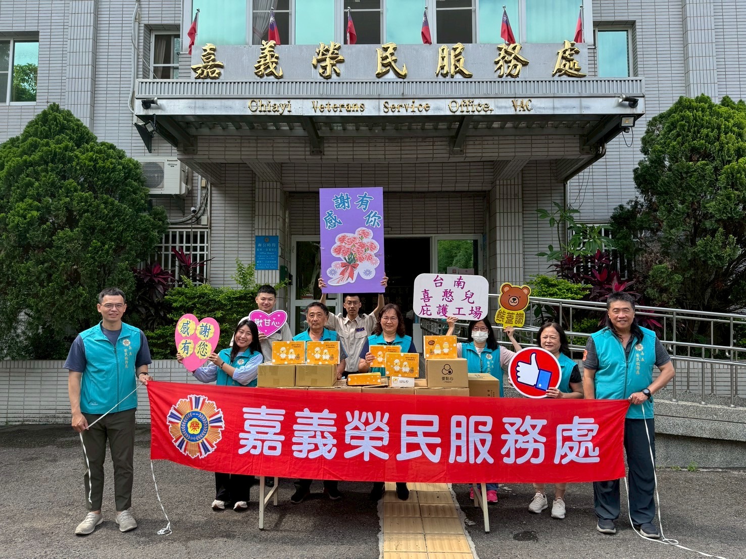 嘉義榮服處處長許淑菁表示,誠摯感謝喜憨兒台南庇護工場長期以來對榮服處的善心支持,此次捐贈的冷凍加熱即食品——包括麻油猴頭菇湯、新城肉骨茶及麵線組合禮盒,共65份,將由榮服處各級幹部及組長親送至轄內弱勢及獨居的退除役官兵與眷屬手中,以表達誠摯的關懷之意;許處長也呼籲社會大眾踴躍參與「認購送愛心」活動,支持庇護工場推動公益,讓愛與善意不斷延續,營造更加溫暖有愛的社會。