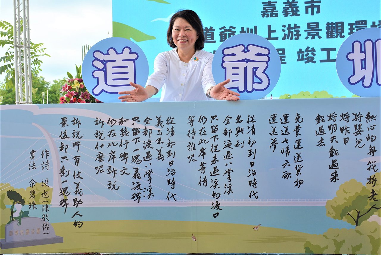 黃敏惠市長指出,道爺圳與嘉義農業發展息息相關,早年能有道爺圳、將軍圳等灌溉系統,是諸羅縣知縣周鍾瑄為嘉義市打下基礎,值得後人珍惜,感謝中研院院士李豐楙擔任「文學步道」策展總監,將嘉義本地詩人作品重新整理匯集,再由書法家余碧珠老師以墨筆呈現,雕刻於步道沿線的詩牆與竹簡,讓這裡成為融合自然、人文與藝術的靜謐空間,這不僅是空間的打造,更是城市精神的延續。
