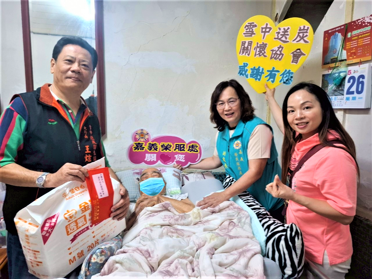 嘉義榮民服務處許淑菁處長特別感謝雪中送炭關懷協會周三貴理事長這幾年來持續不斷的贊助慰問金與生活物資,嘉惠許多有需要的榮民眷家庭,該會也在端午節前夕,由執行長王炫堂、理事洪憶朝代表,特地到嘉義地區,由嘉義榮民服務處副處長曾秀琴陪同前往榮民眷家中關懷慰問,將社團的關心與祝福直接帶到榮民(眷)家庭裡,彼此寒喧關懷,社團夥伴們也有感家屬照顧的不易,貼心叮嚀家屬除了注意長輩外,也要注意自己的身體狀況,並致贈慰問金及成人尿布,希望能為家庭帶來一些幫助。